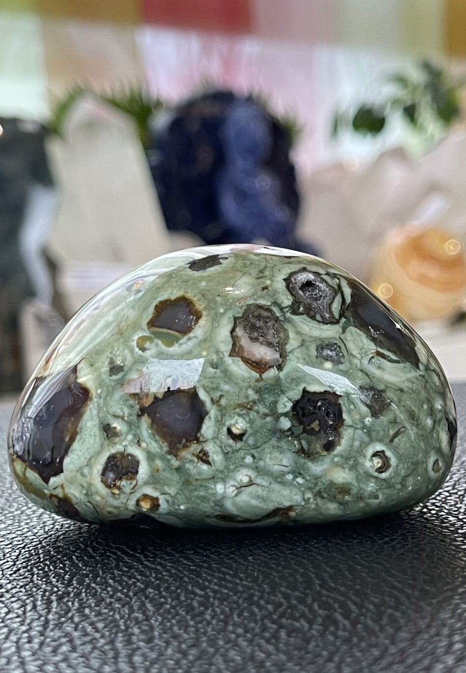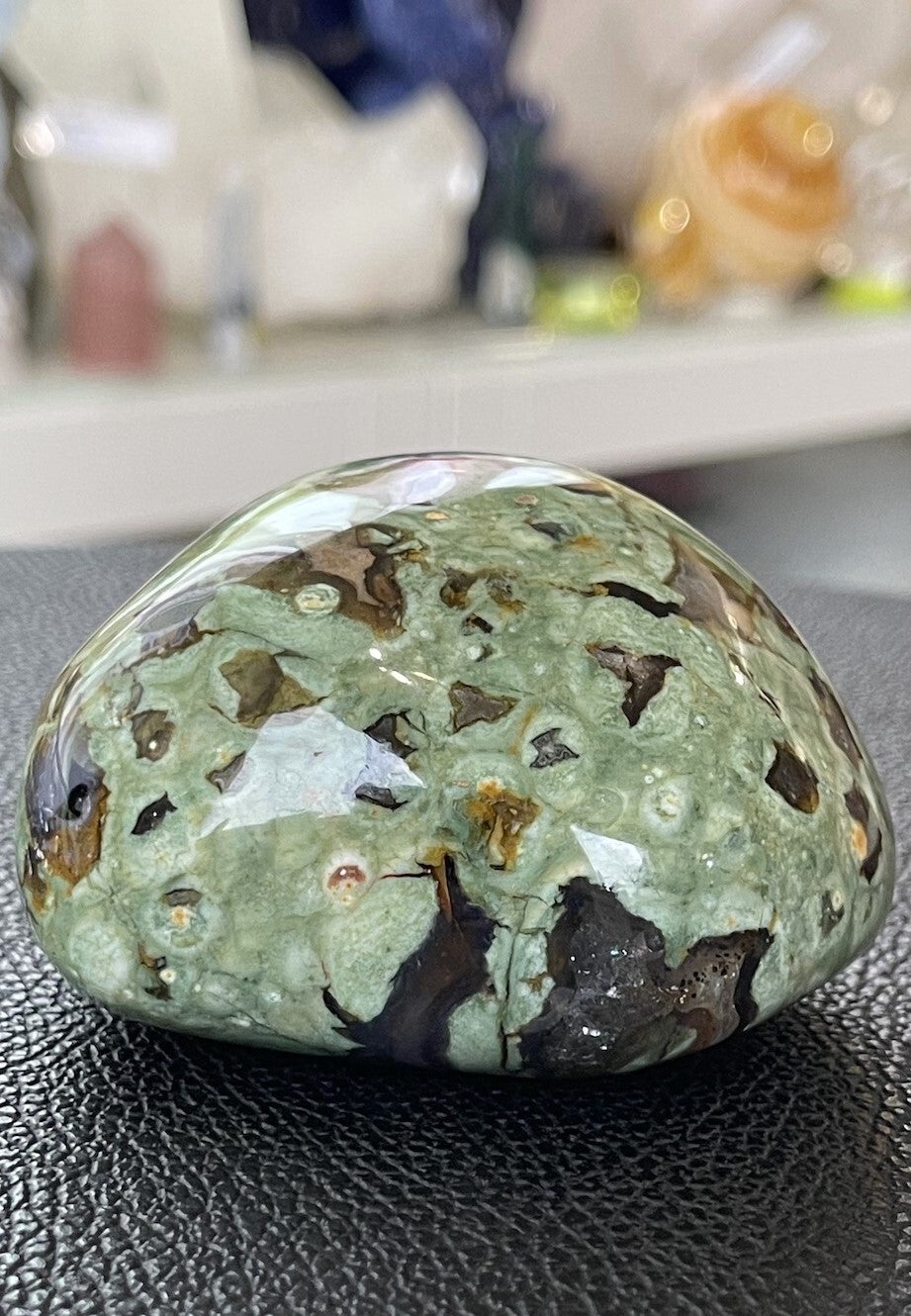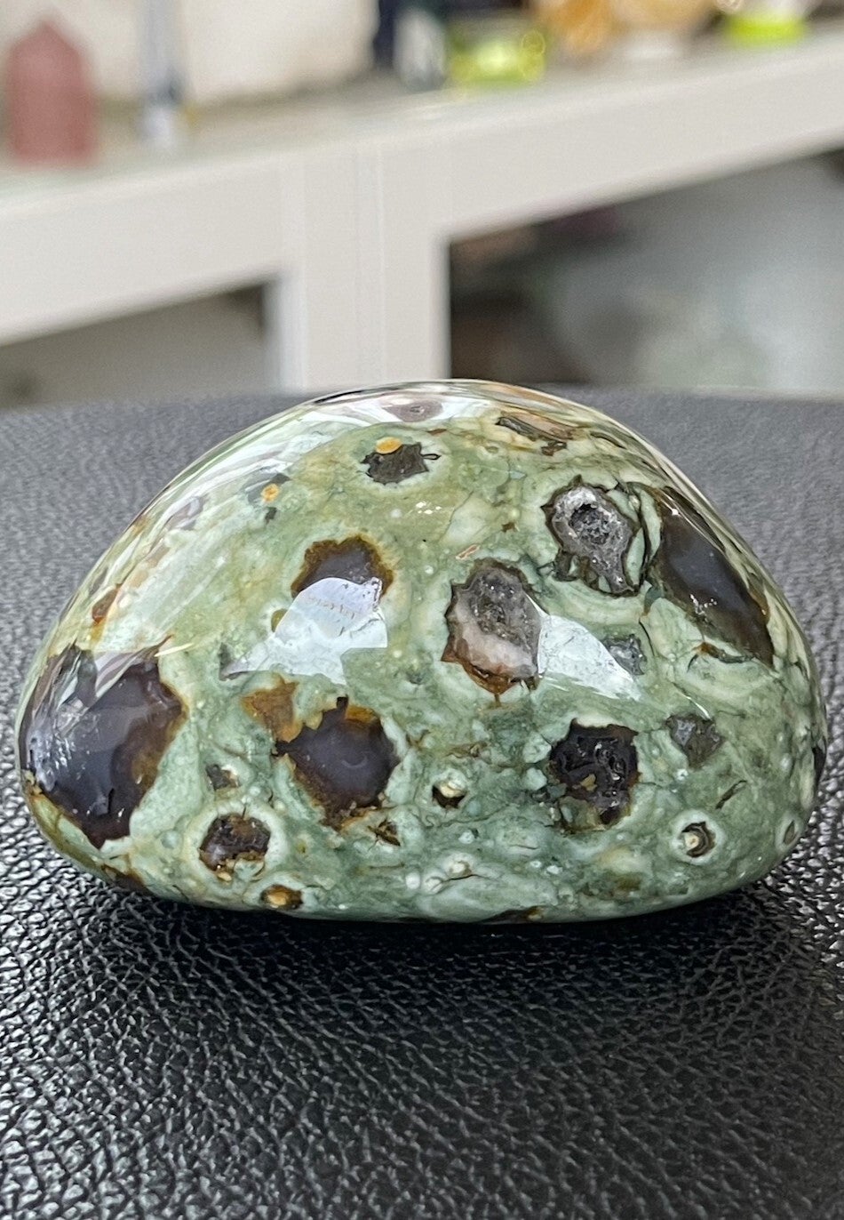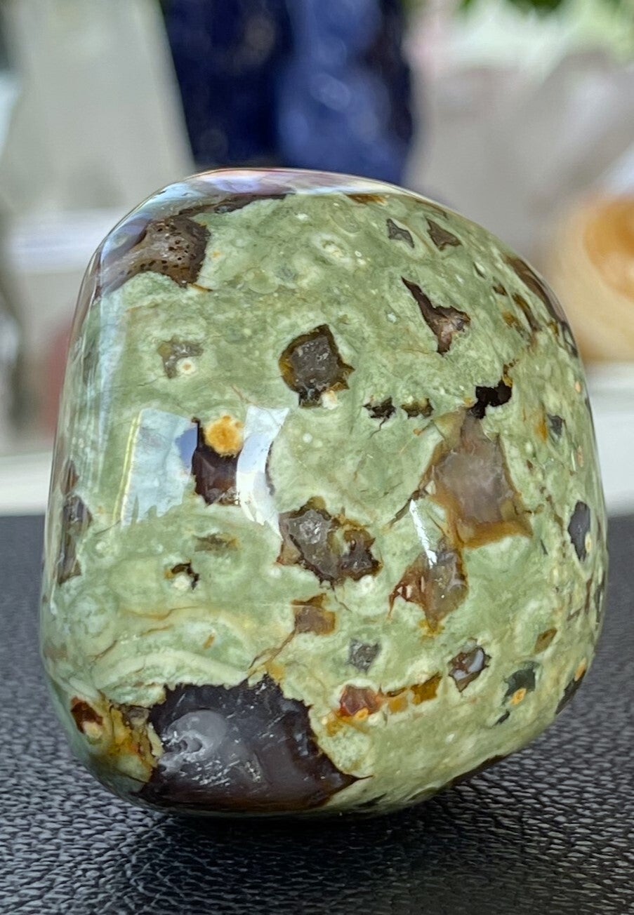 Rhyoliet bevordert zelfrespect, eigenwaarde en helpt je jezelf te accepteren zoals je bent. Het zorgt ervoor dat je sterk in je eigen kracht staat en in evenwicht bent. Hierdoor kun je beter omgaan met belastende situaties, veranderingen en problemen. De steen geeft een bepaalde helderheid van geest en schept duidelijkheid. Onevenwichtige emoties worden in balans gebracht.