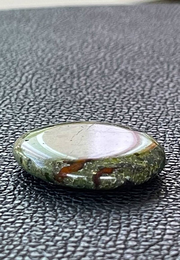 Drakenbloed Jaspis is een combinatiekristal bestaande uit Epidoot en het rode gesteente Piemontiet. De steen wordt ook Dragonstone genoemd.