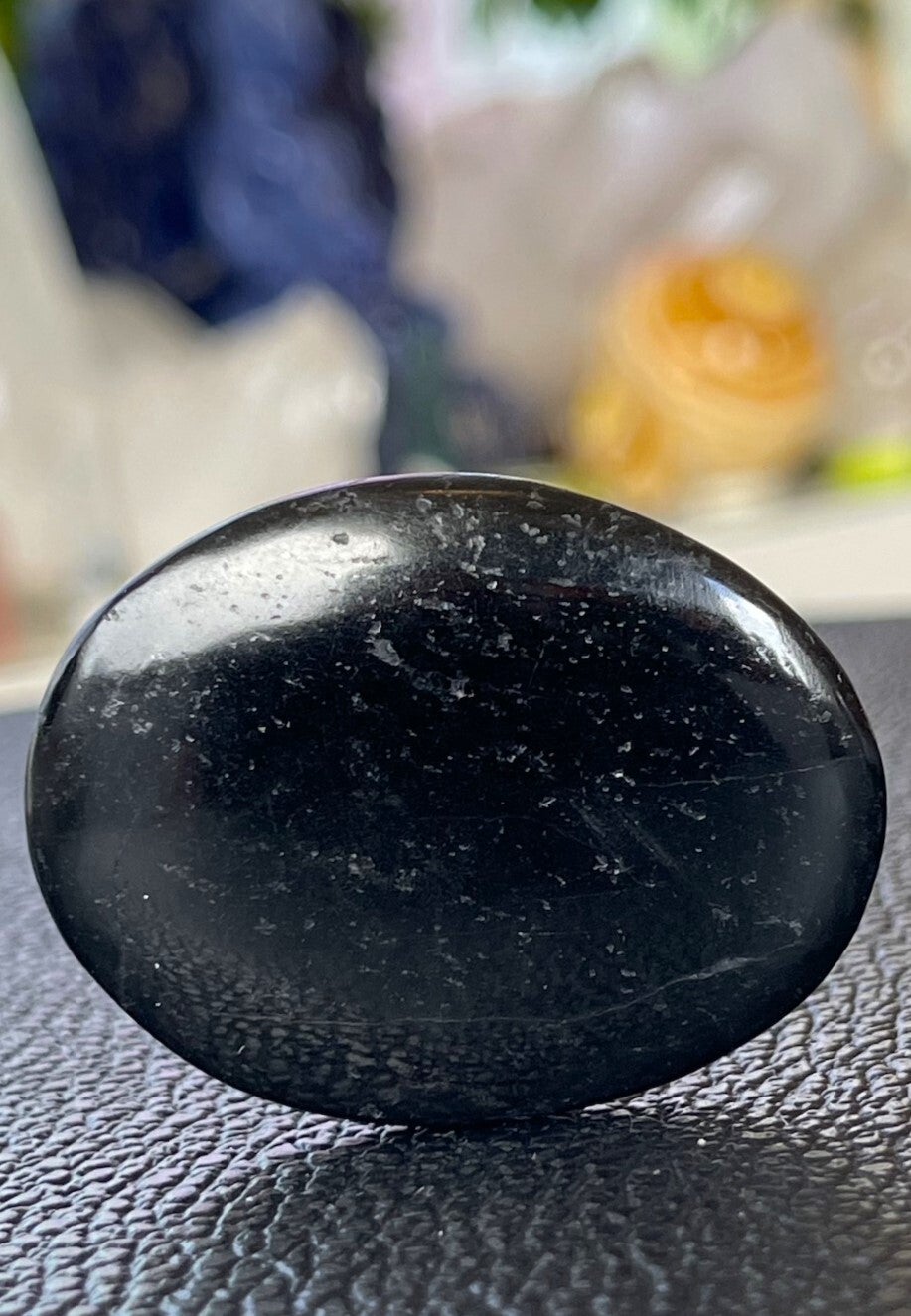 Zwarte Toermalijn platte knuffelsteen of zaksteen