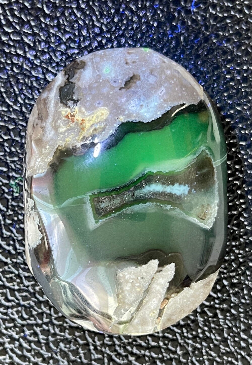 Vulkaanagaat is een recent gevonden fluorescerende steen die onder UV licht deels groen kleurt.