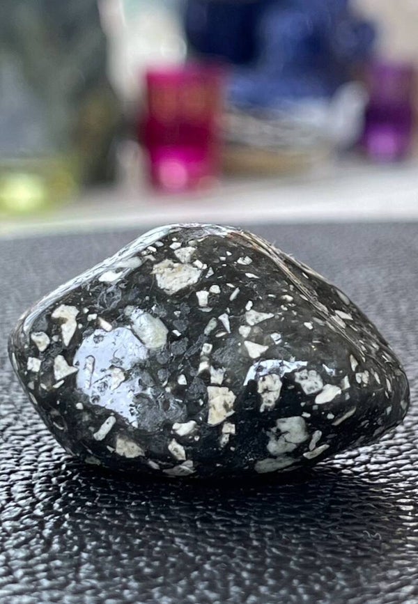 Parelhoen Jaspis, een aardende steen verbonden met de wortelchakra, zou de geest kalmeren en stress verminderen en is vernoemd naar de parelhoen, vanwege de gelijkenis van gespikkelde patronen.
