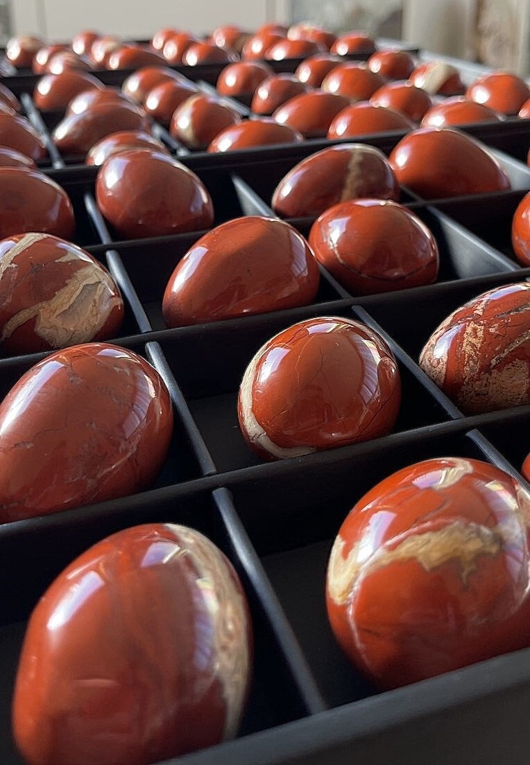 Rode Jaspis heeft de algemene eigenschappen van Jaspis, maar is daarnaast één van de meest dynamische en activerende Jaspis soorten. Het werkt aardend en bevordert de energiedoorstroming door blokkades te doorbreken in de onderste chakra's en knieën.