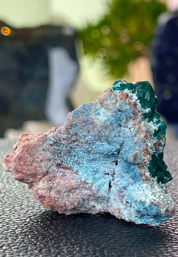 Ruw stukje Dioptaas met Chrysocolla op Kwarts uit Koakoveld, Namibië, klein tot medium