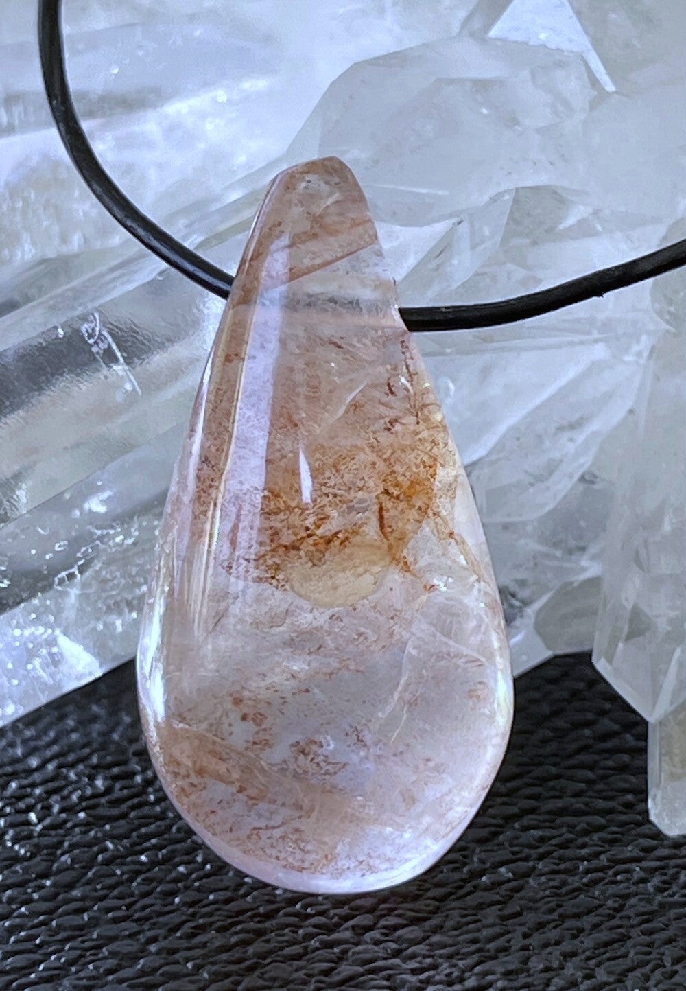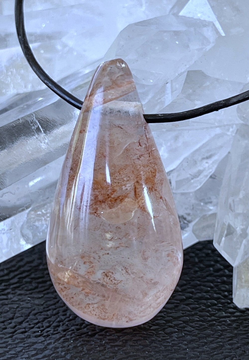 Maria Magdalena Lemurian Kwarts hangertje, doorboorde kegelvormige druppel, met veter