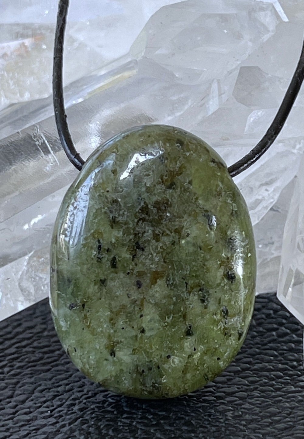 Peridoot met Flogopiet uit Piemonte Italië, hanger doorboord, met veter