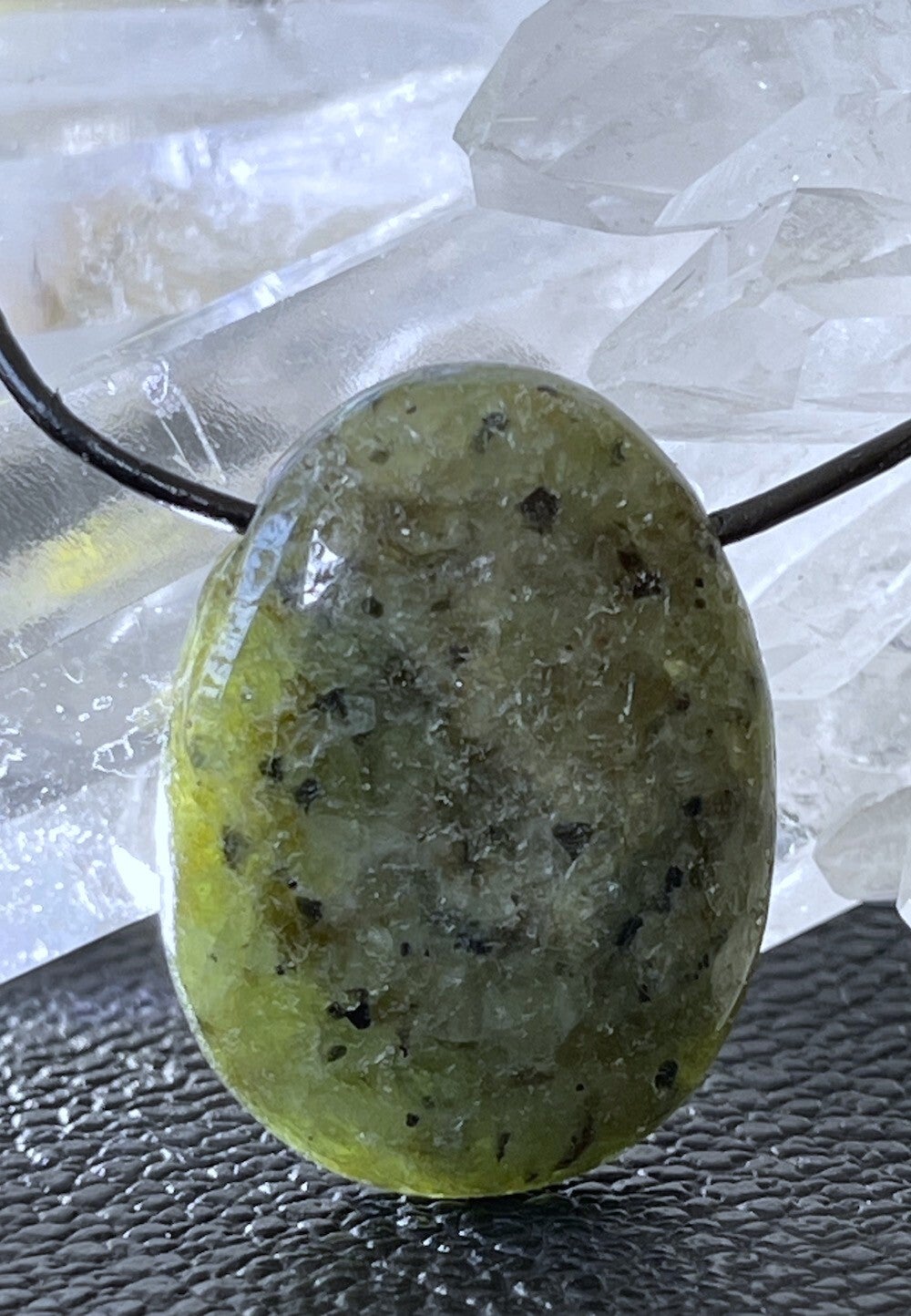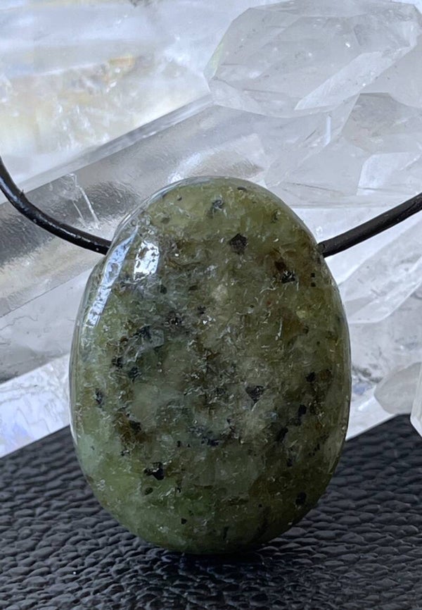 Peridoot met Flogopiet uit Piemonte Italië, hanger doorboord, met veter