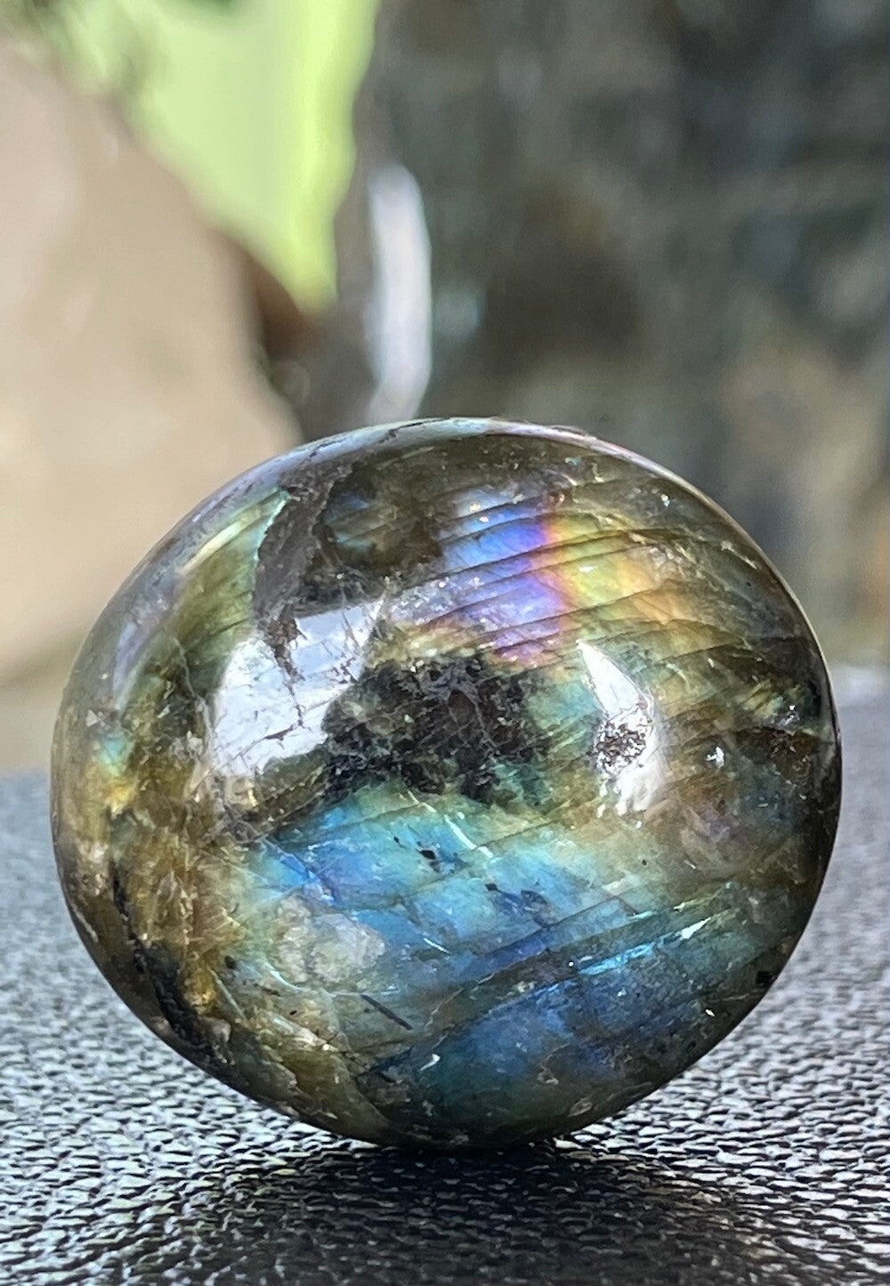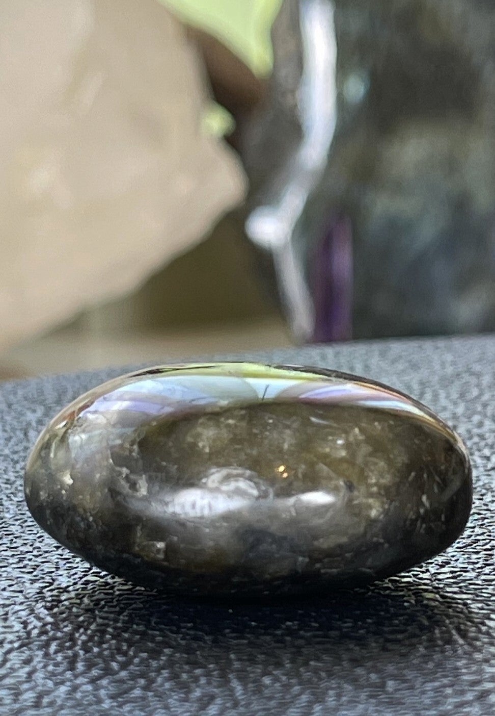 Beetje bolle Labradoriet platte knuffelsteen of zaksteen, medium
