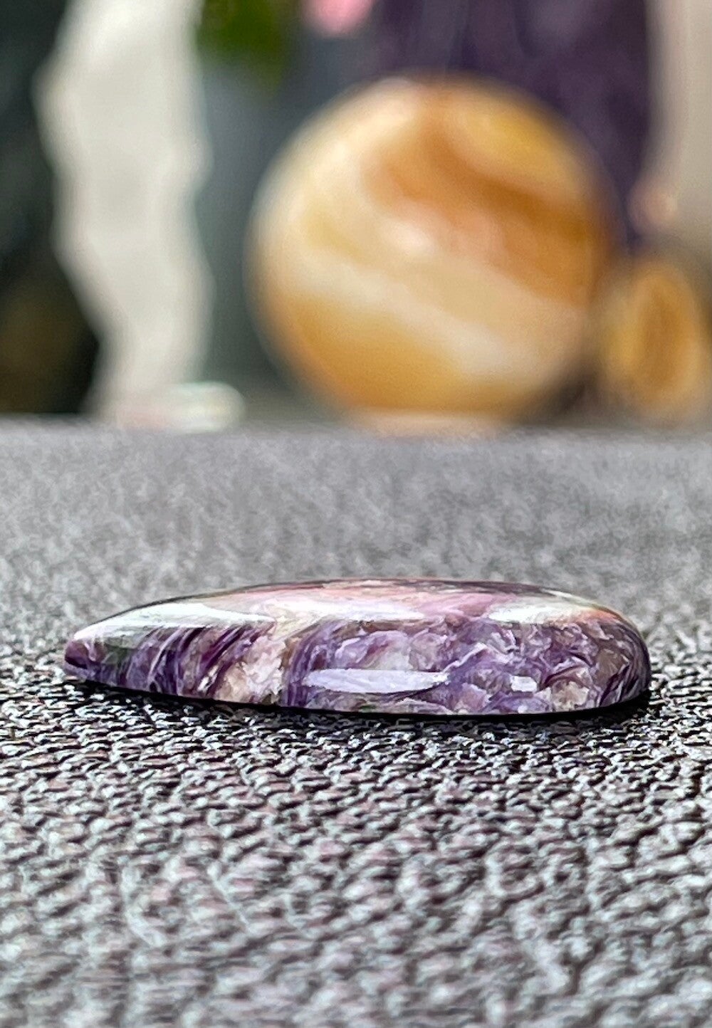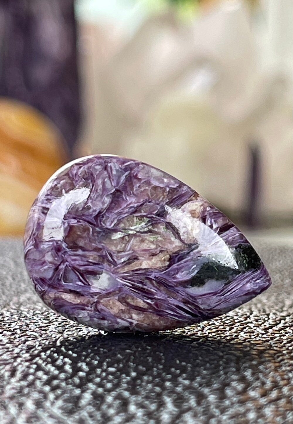 Charoiet edelsteen cabochon druppel met vlakke achterkant, medium
