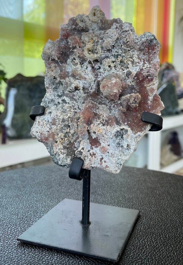 Mooi ruw plat stuk Amethist uit Brazilië, met metalen standaard, groot