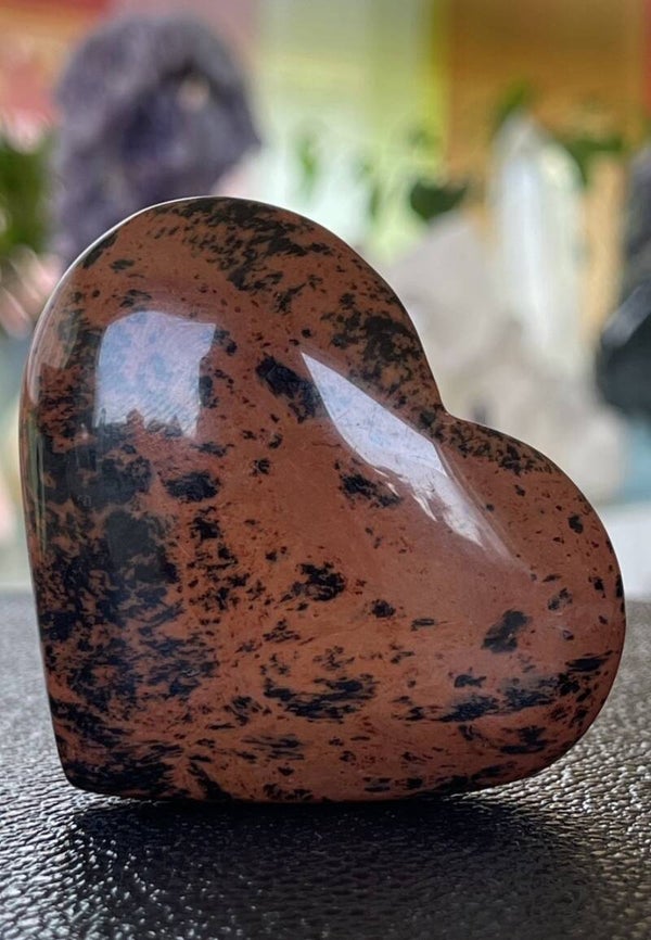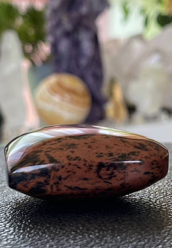 Mahonie Obsidiaan zorgt voor een goede aarding, beschermt, geeft kracht in tijden van nood en zorgt voor afvoer van negativiteit die loskomt. Bij onrust in de buik. Versterkt de aura, heft energieblokkades op.