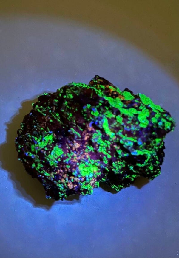 Onder Ultraviolet licht kleurt het kristal naar felgroen