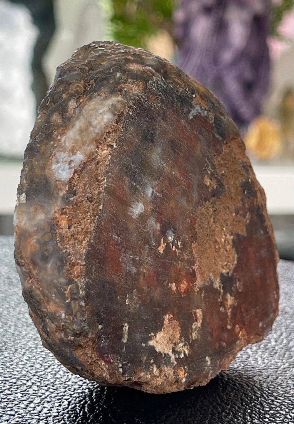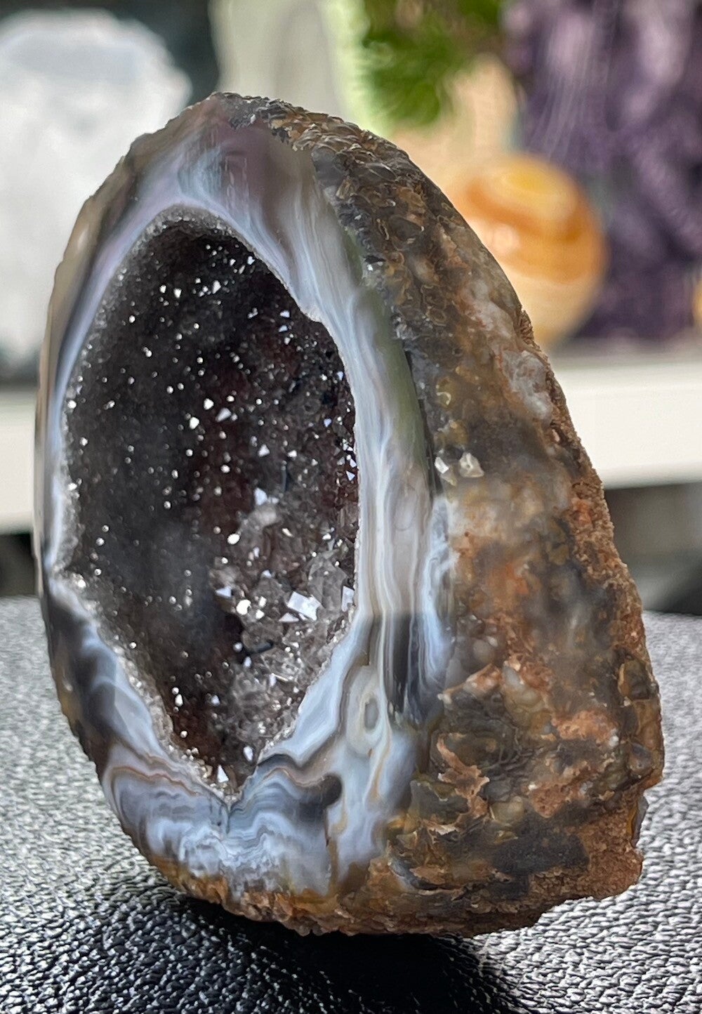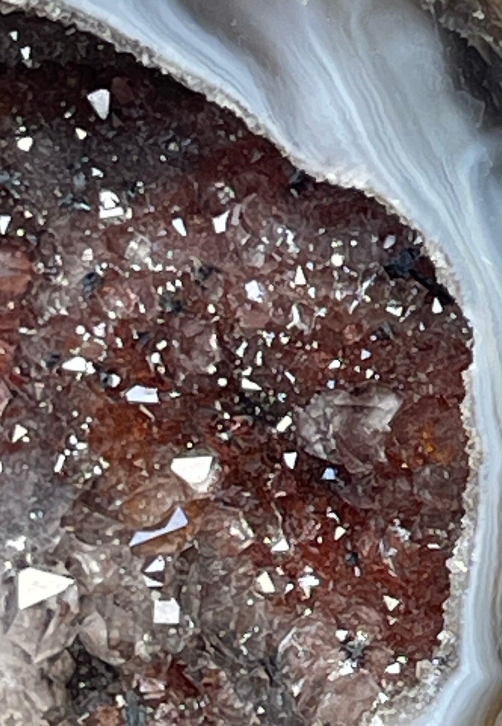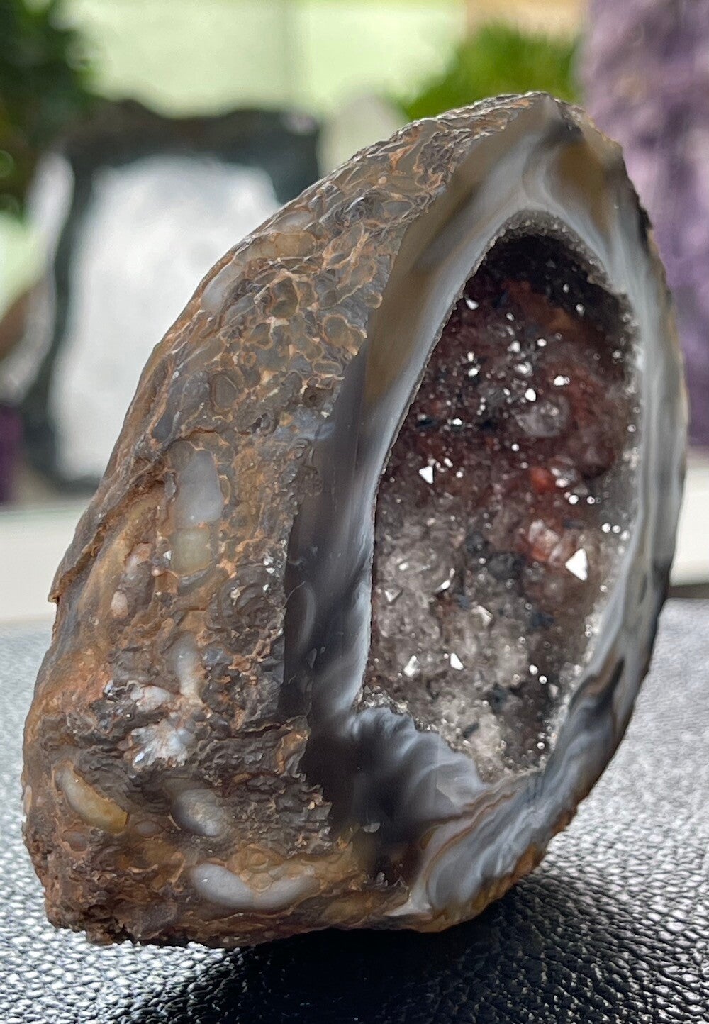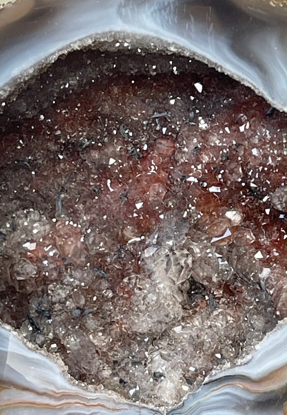 Mooi ruw stukje Agaat geode met Kwarts en Hematiet, gepolijste rand en vlakke achterkant, medium