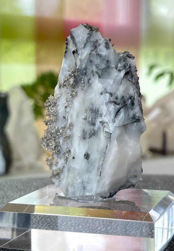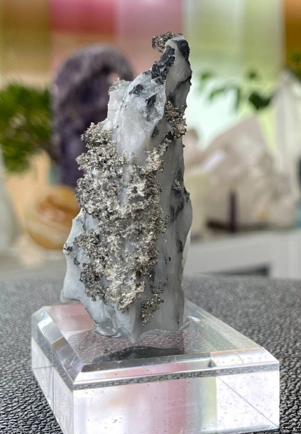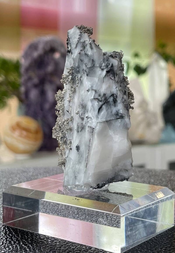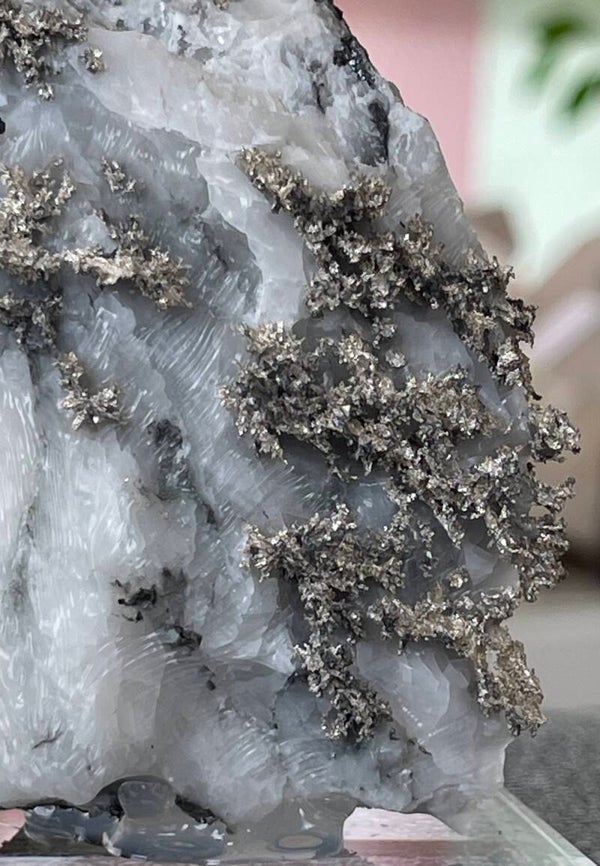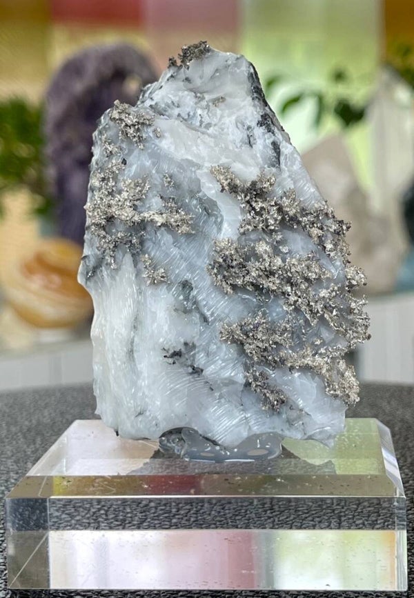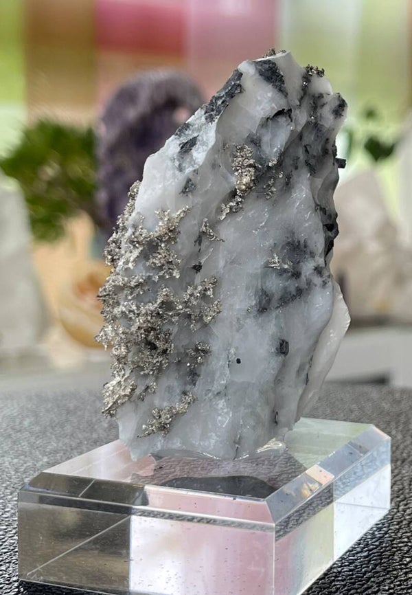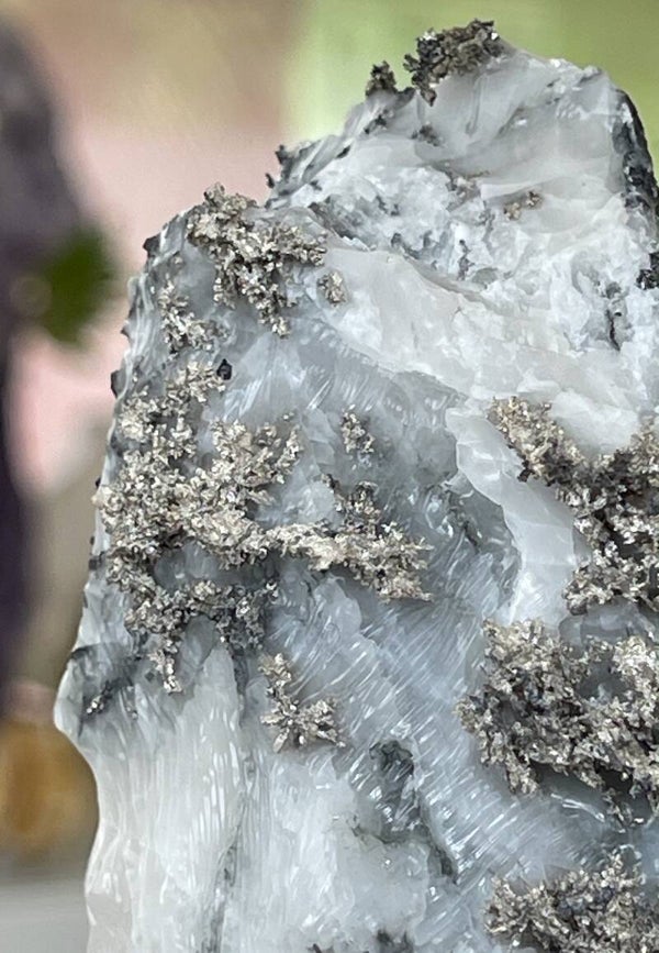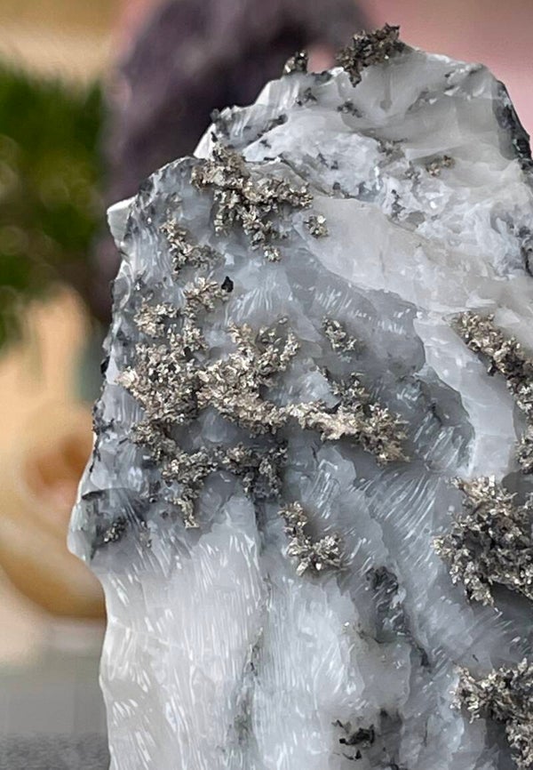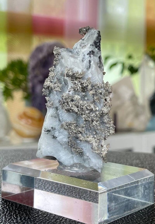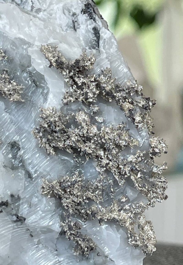 Zilver, ook bekend als native Zilver, is een zeldzaam en fascinerend mineraal dat in pure vorm voorkomt in de natuur. Het vormt vaak grillige, draadachtige structuren en komt voor in combinatie met andere mineralen zoals hier met Calciet.