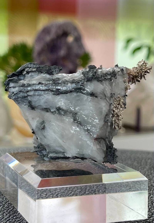Zilver, ook bekend als native Zilver, is een zeldzaam en fascinerend mineraal dat in pure vorm voorkomt in de natuur. Het vormt vaak grillige, draadachtige structuren en komt voor in combinatie met andere mineralen zoals hier met Calciet.