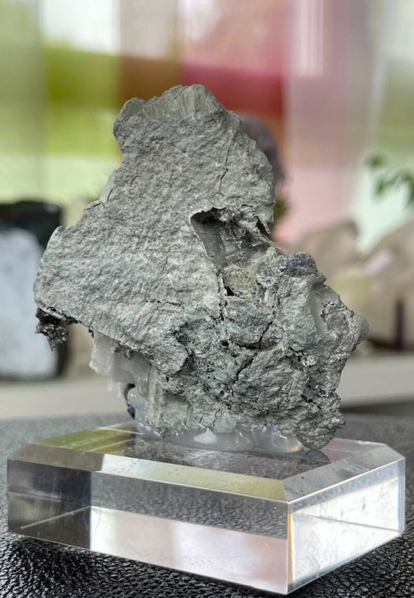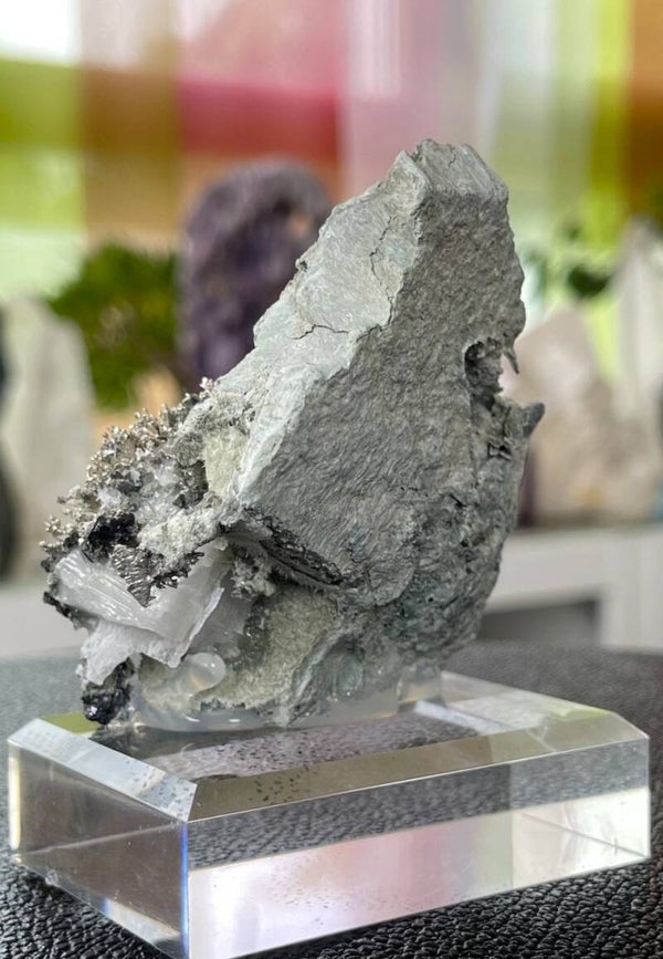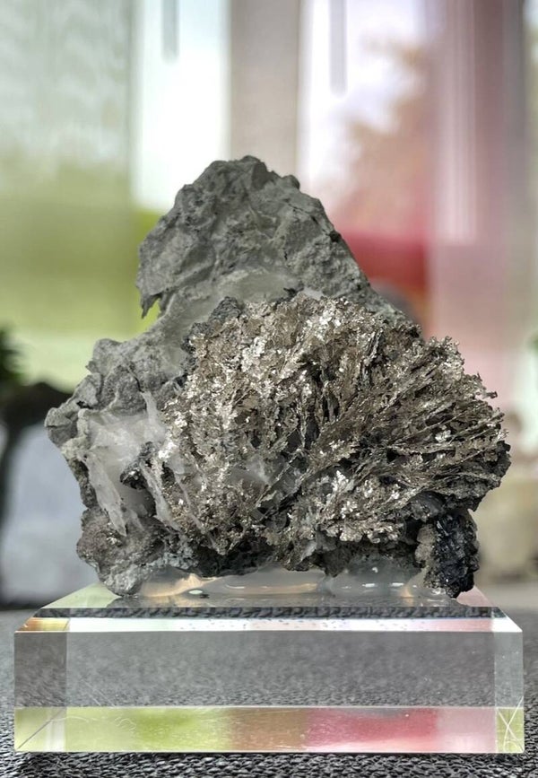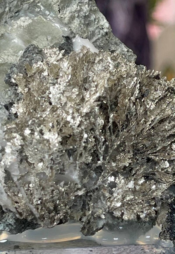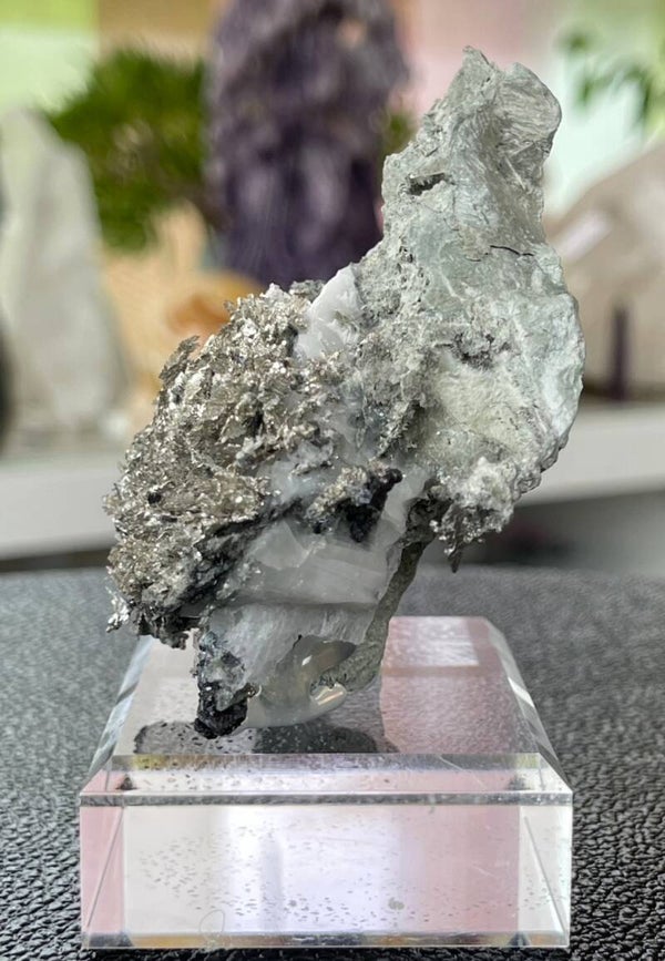 Zilver, ook bekend als native Zilver, is een zeldzaam en fascinerend mineraal dat in pure vorm voorkomt in de natuur. Het vormt vaak grillige, draadachtige structuren en komt voor in combinatie met andere mineralen zoals hier met Calciet.