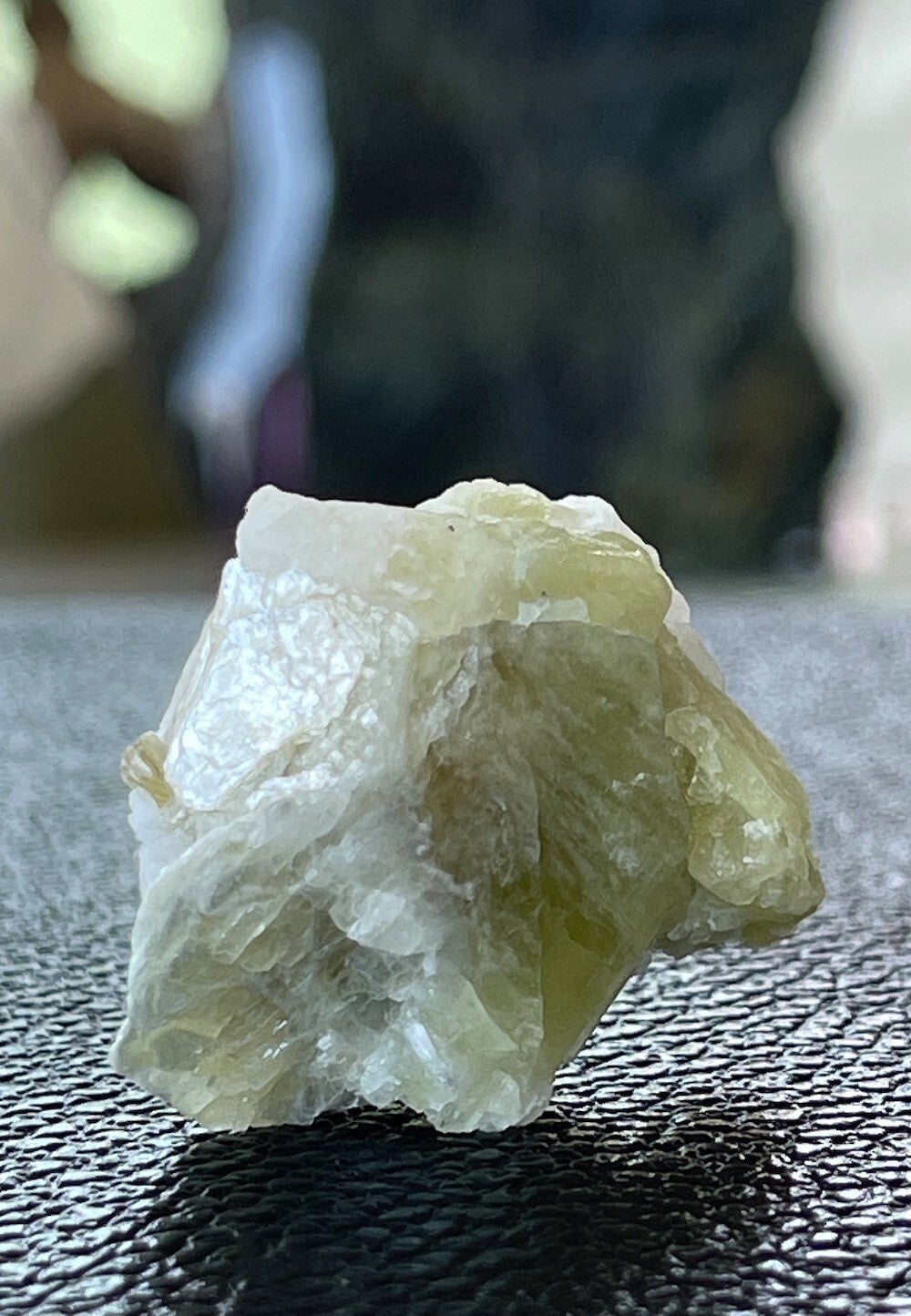 Ruw stukje natuurlijke gele Brazilianiet met Clevelandiet (Albiet) en Muscoviet (mica) uit Telírio claim Linópolis, Divino das Laranjeiras, Minas Gerais, Brazilië, klein tot medium