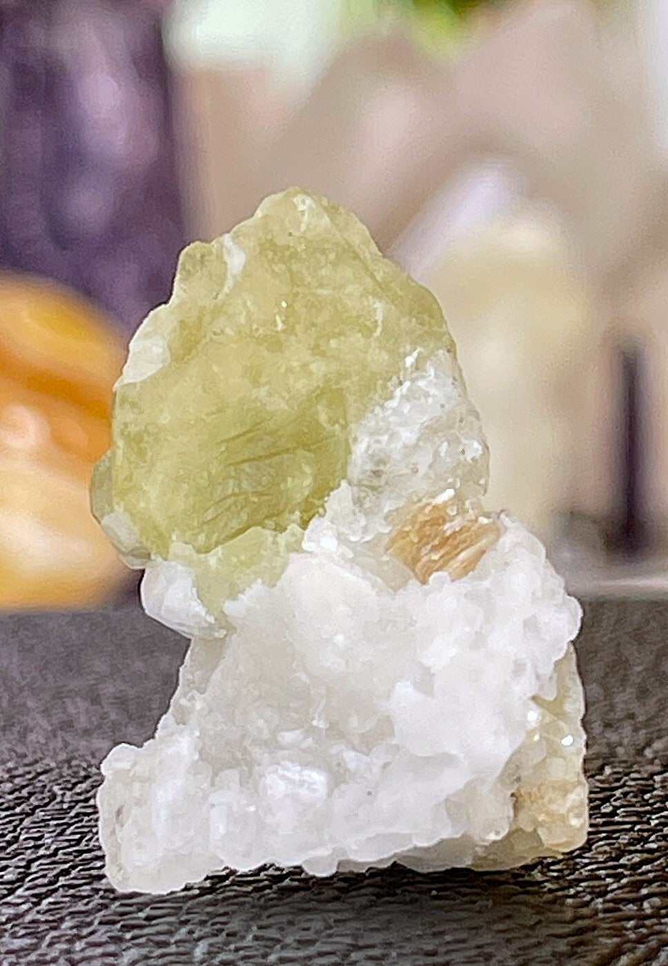 Ruw stukje natuurlijke gele Brazilianiet met Clevelandiet (Albiet) uit Telírio claim Linópolis, Divino das Laranjeiras, Minas Gerais, Brazilië, klein