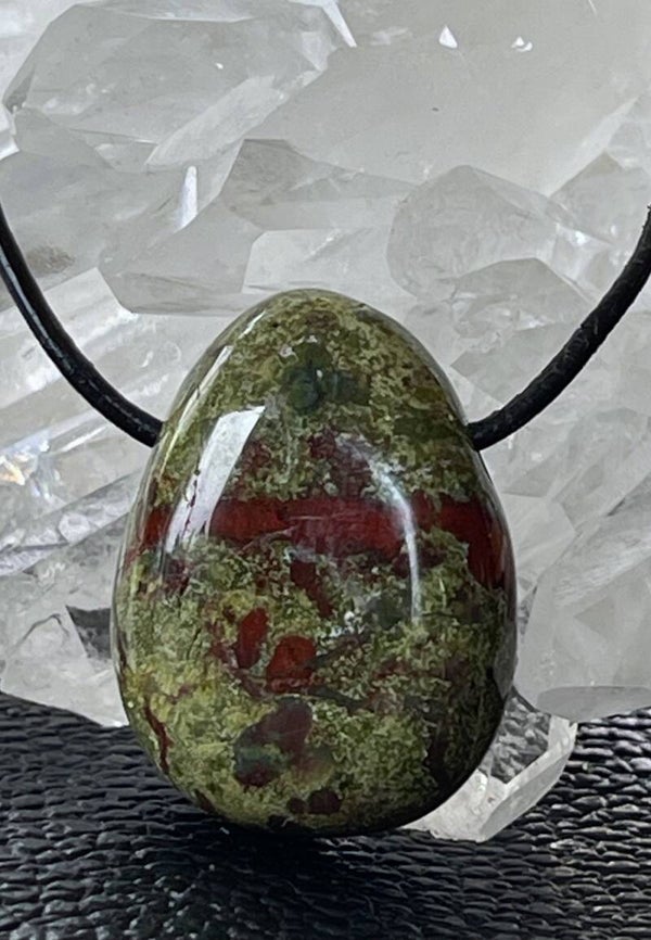 Drakenbloed Jaspis doorboorde hanger uit Simbabwe, met veter
