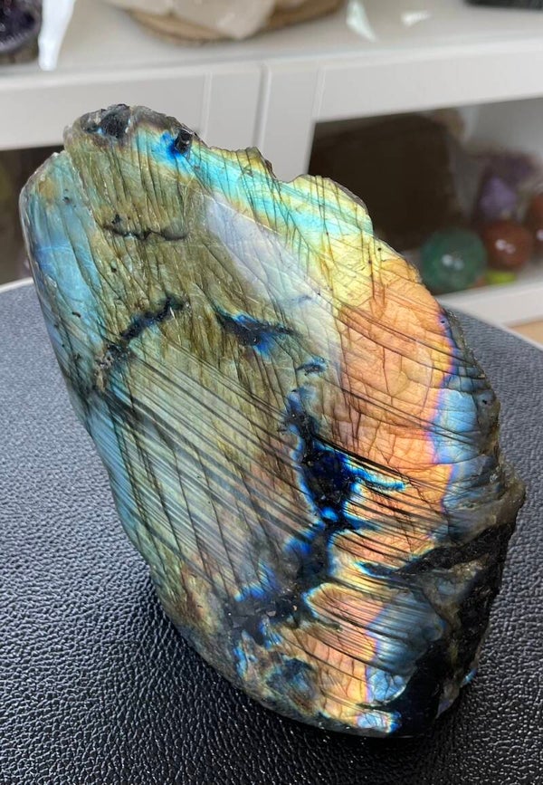 Labradoriet uit Madagascar groot ruw stuk, aan één zijde gepolijst, kan staan