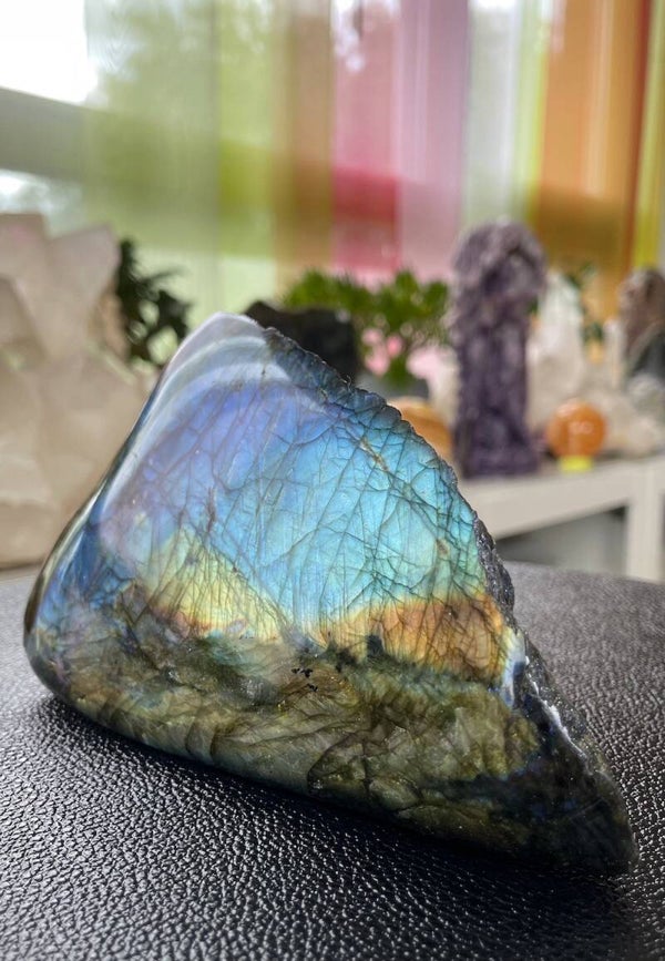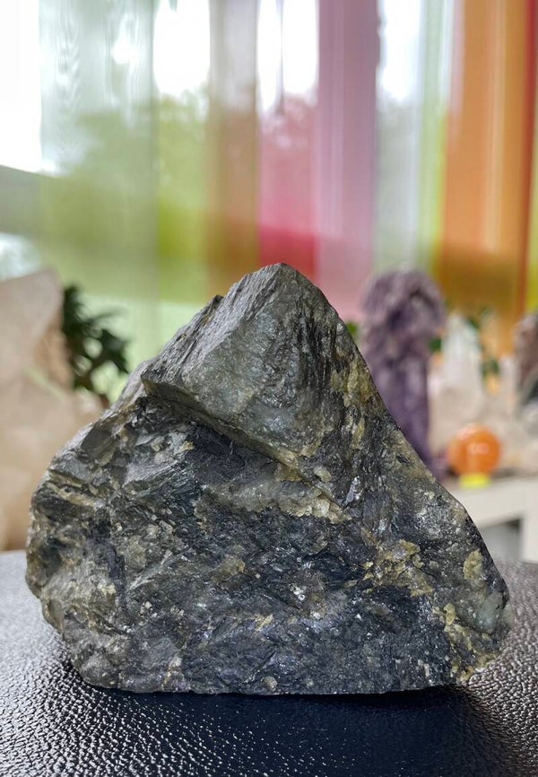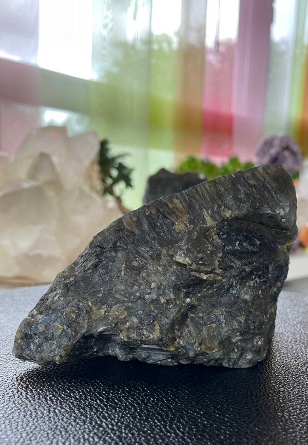 Labradoriet uit Madagascar groot ruw stuk, aan één zijde gepolijst, kan staan
