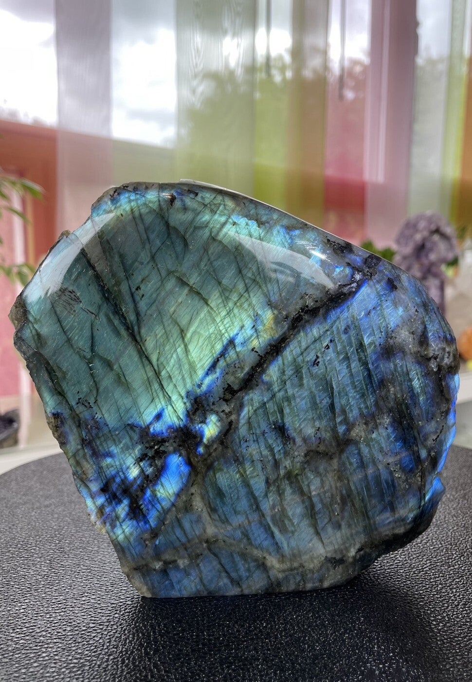 Labradoriet uit Madagascar groot ruw stuk, aan één zijde gepolijst, kan staan, groot
