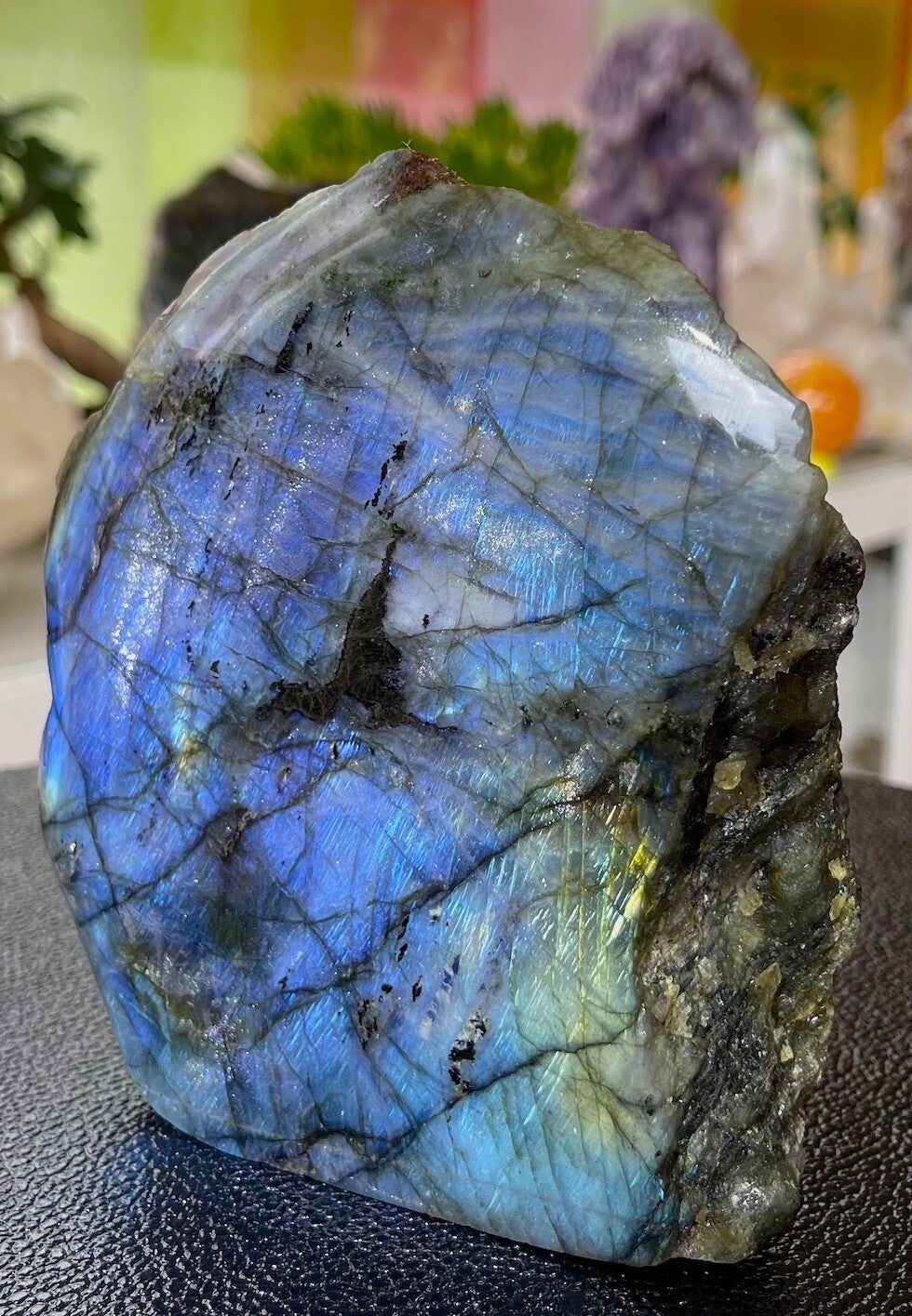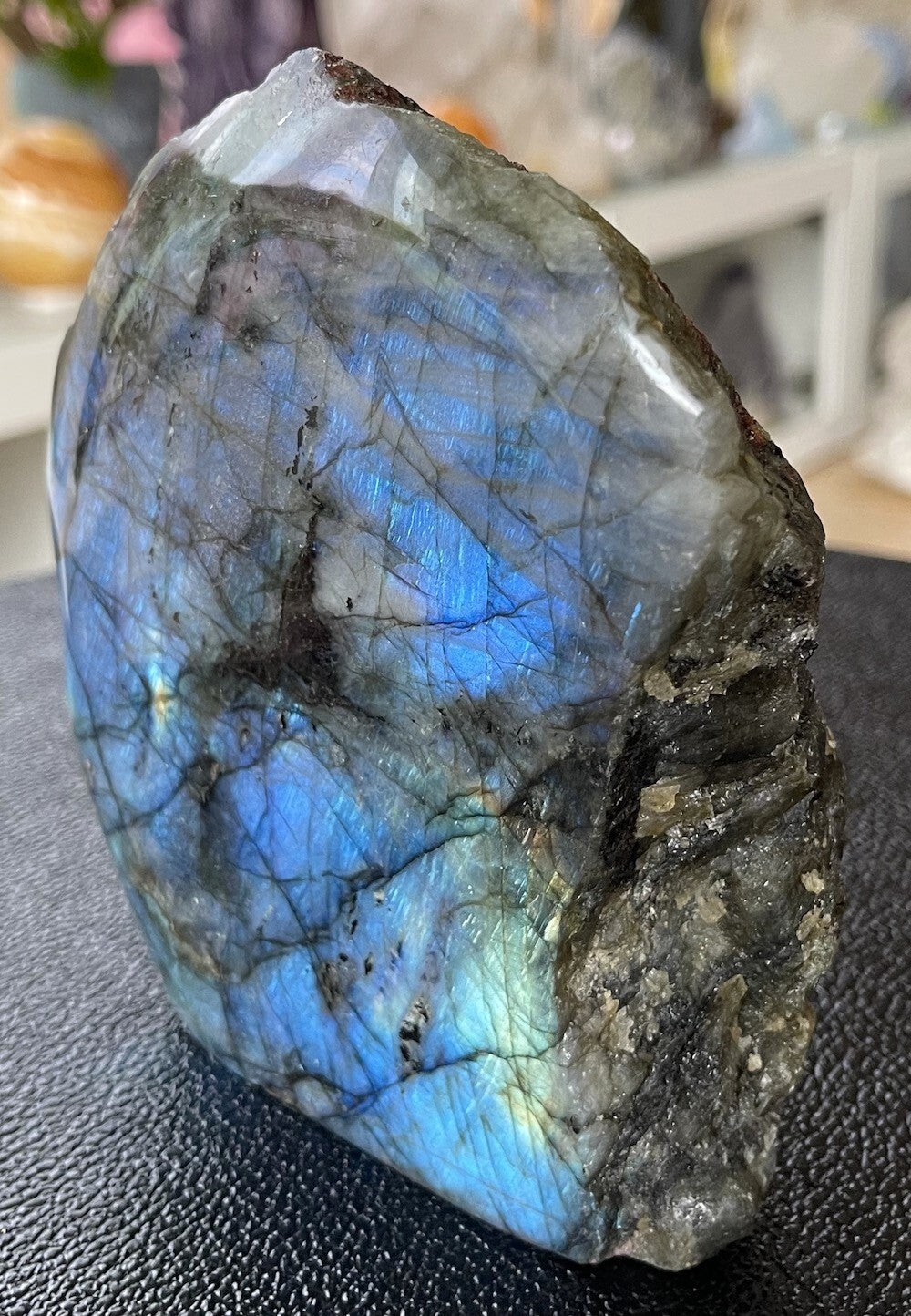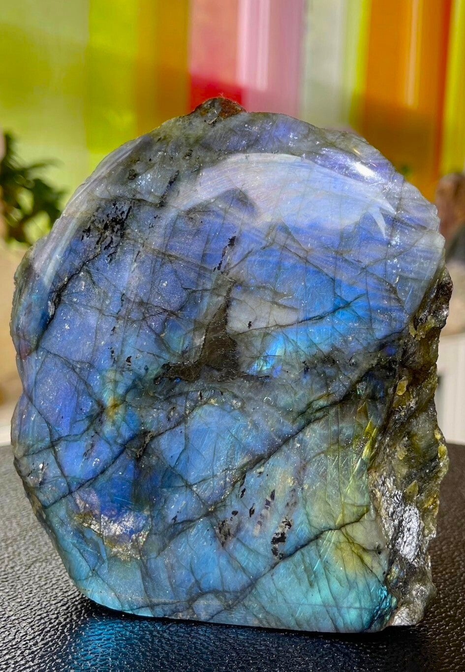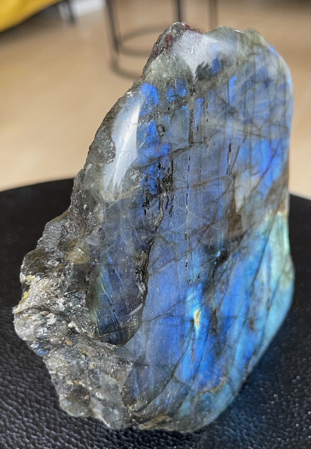 Labradoriet uit Madagascar groot ruw stuk, aan één zijde gepolijst, kan staan