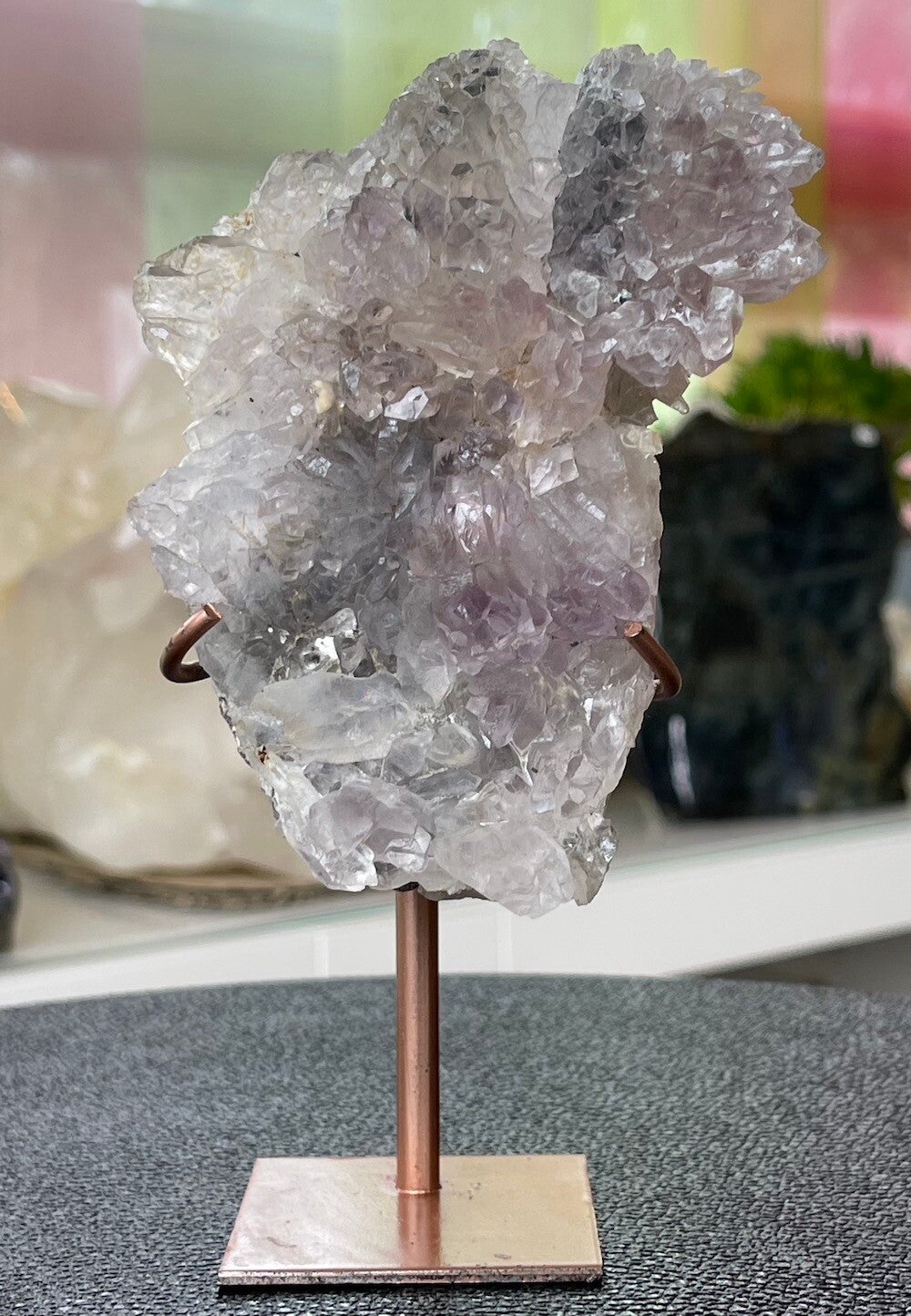 Amethist is vanwege haar reinigende werking ook heel geschikt om een ruimte te zuiveren. Samen met Bergkristal en Rozenkwarts creëert het een harmonische sfeer. Omdat het de bovenste chakra’s stimuleert, kan het de intuïtie, spirituele groei en inzichten bevorderen, zeker voor mensen die aan het begin staan van hun spirituele pad.