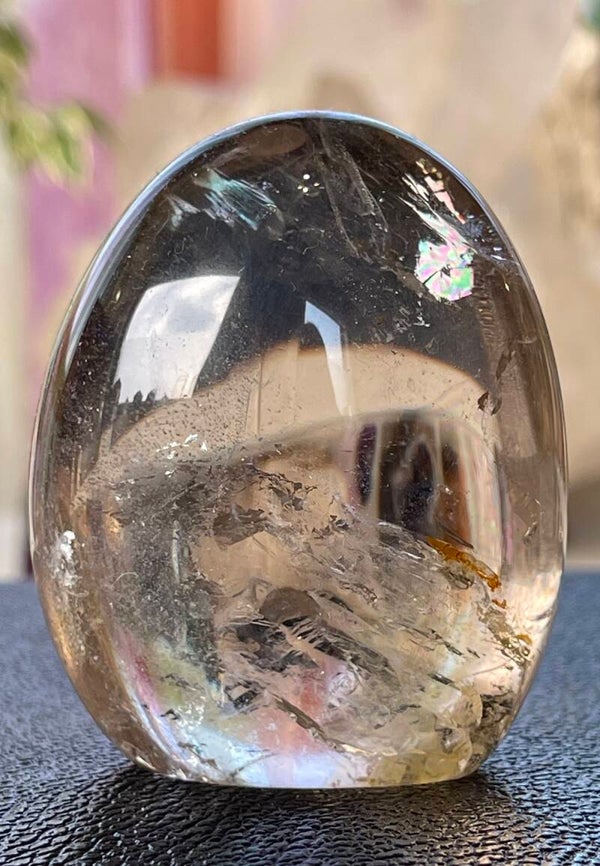 Prachtige Rookkwarts free form sculptuur licht van kleur, met regenboog in de steen gepolijst, kan staan, klein tot medium