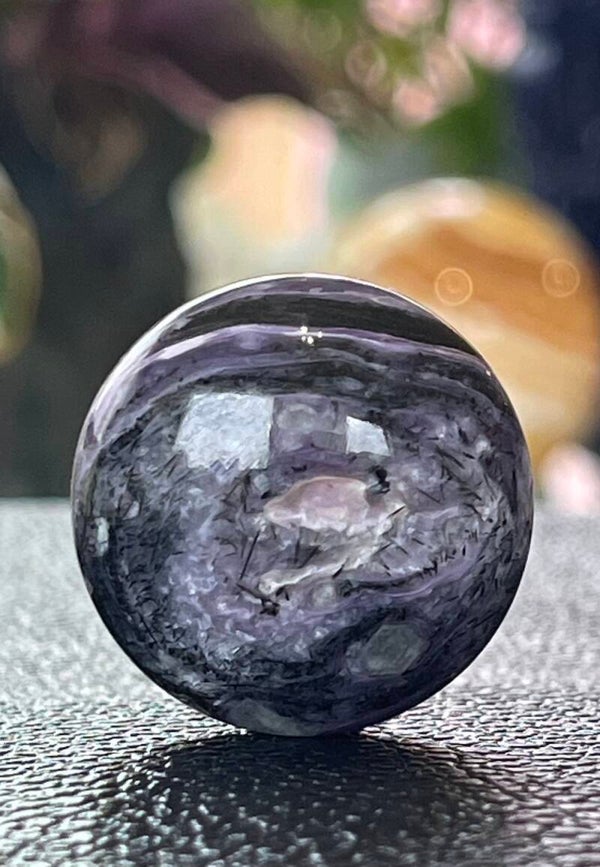Charoiet edelsteen uit Malyy Murun Massiv, Siberië, cabochon rond met vlakke achterkant, op Onyx geplakt voor stevigheid, medium