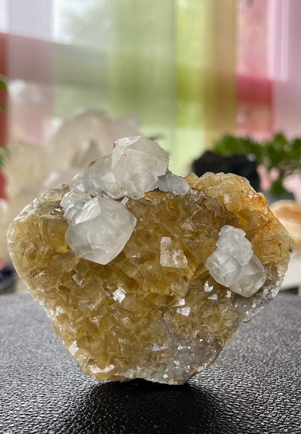 Prachtig ruw stuk gele Fluoriet met Calciet uit Mina Moscona, Asturias Spanje met heldere kubussen, medium