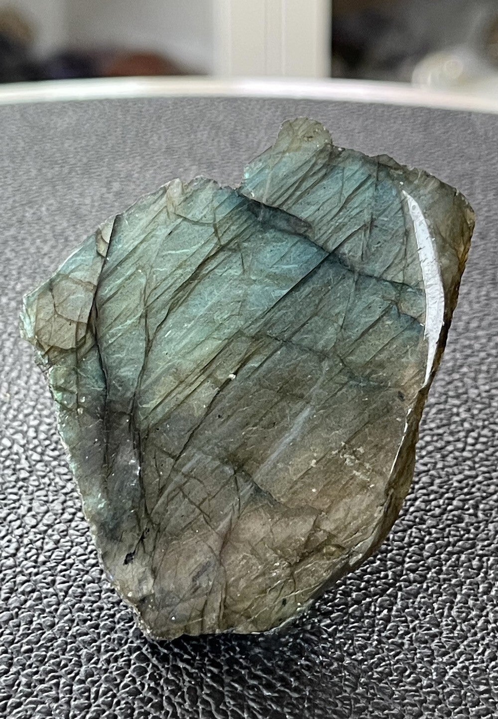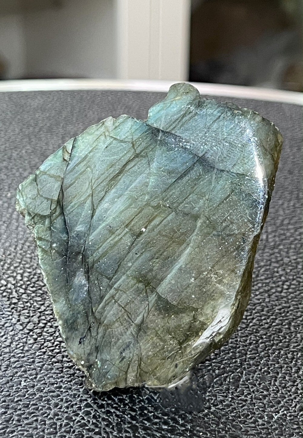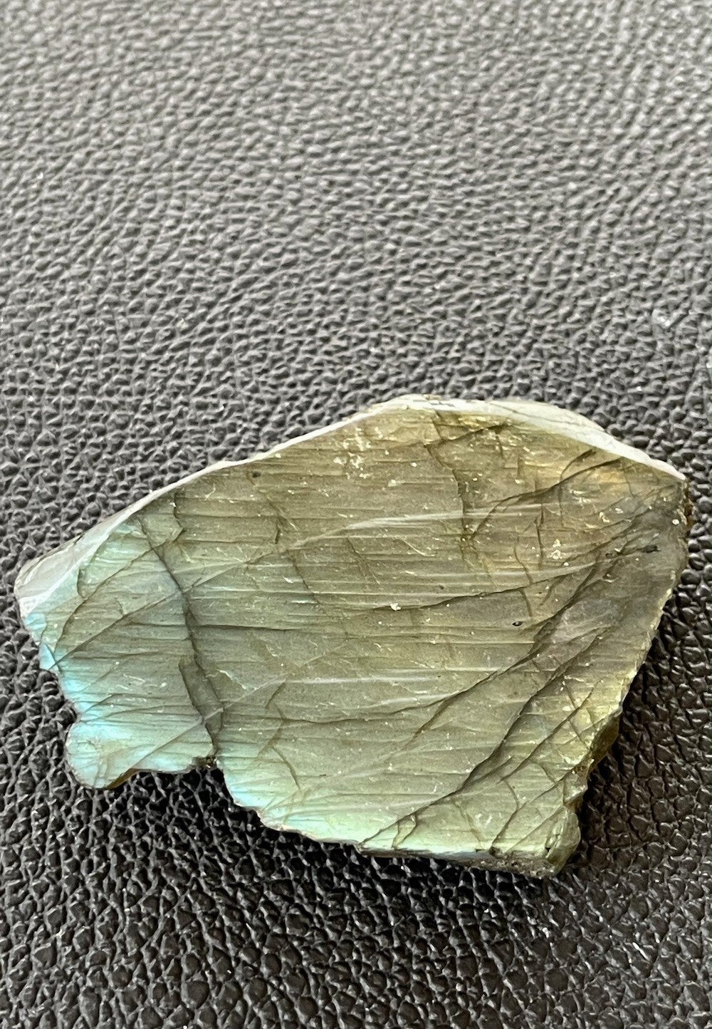 Ruw plat stukje Labradoriet uit Madagascar, aan één zijde gepolijst, ook aan de achterzijde een mooie glans, klein tot medium