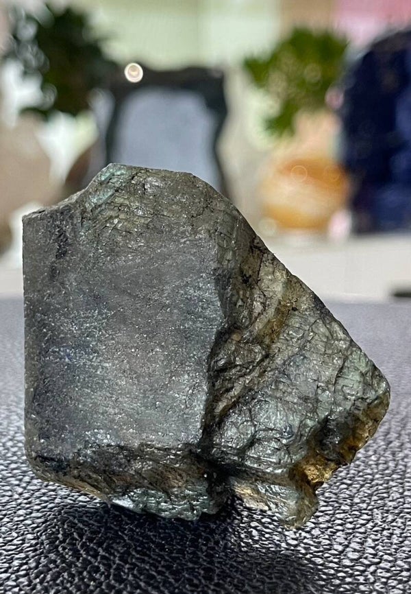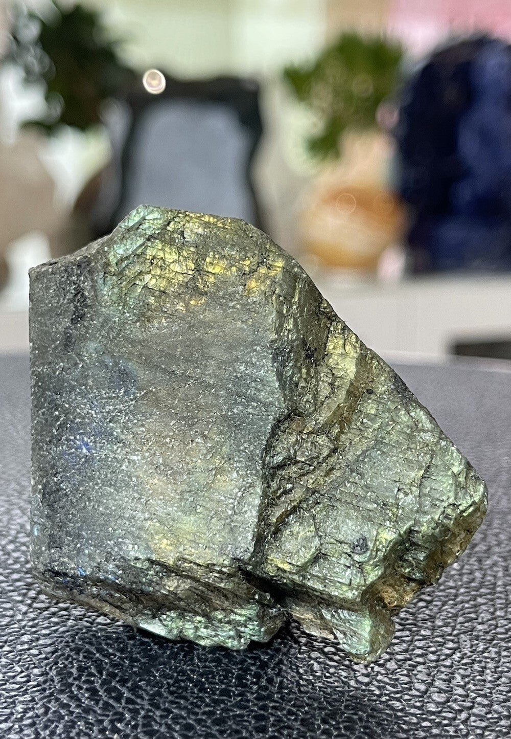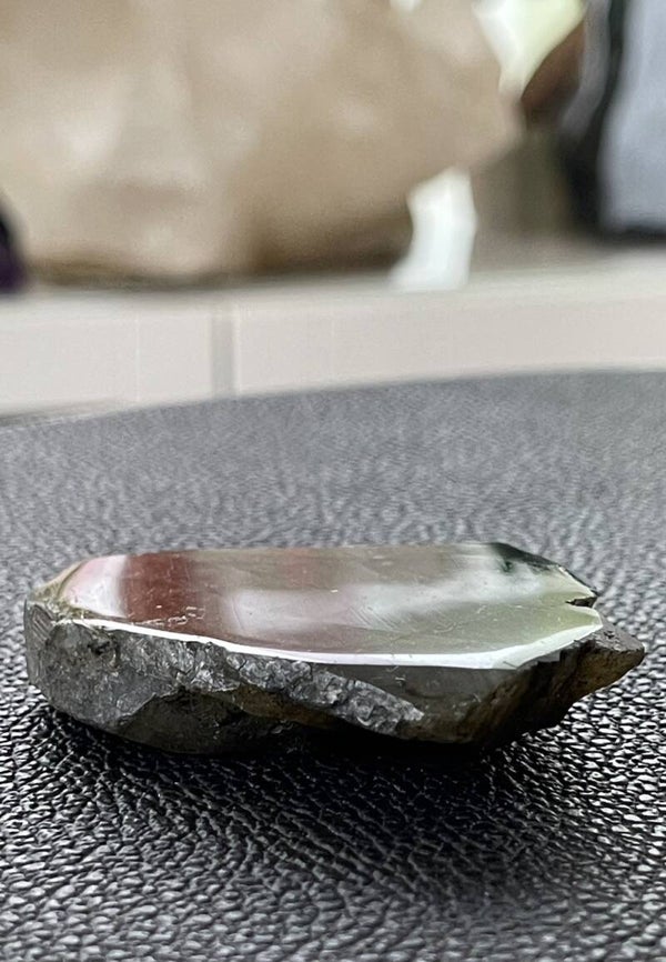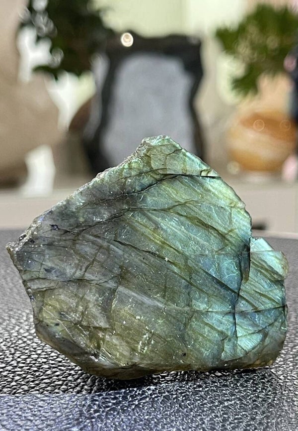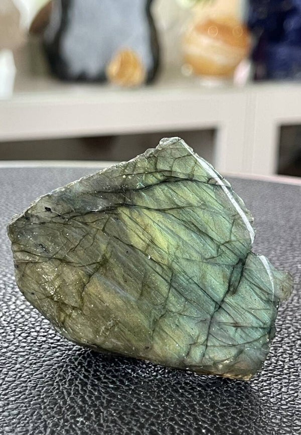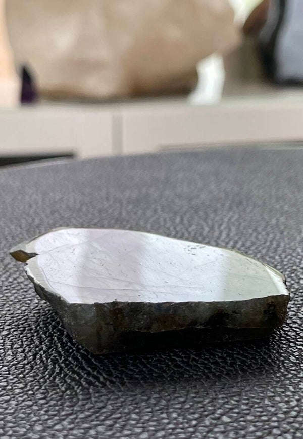 Ruw plat stukje Labradoriet uit Madagascar, aan één zijde gepolijst, ook aan de achterzijde een mooie glans, klein tot medium