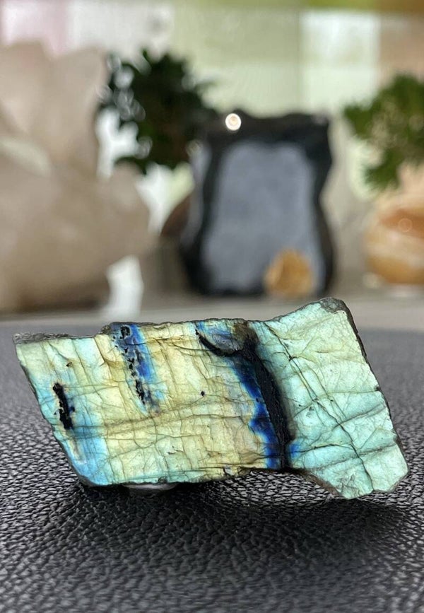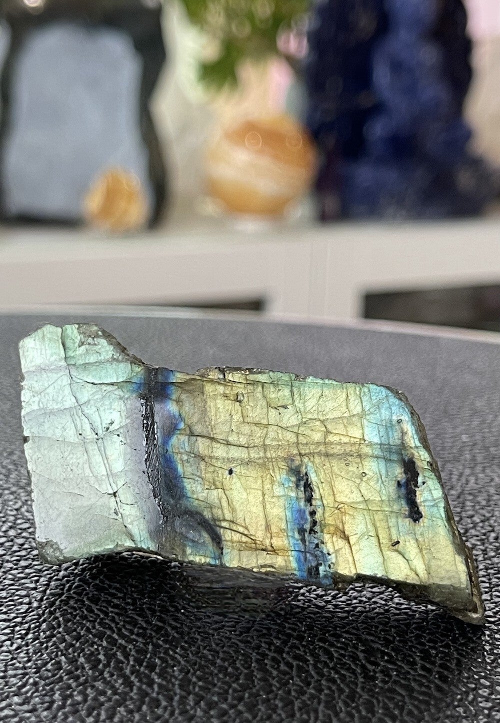 Mooi ruw plat stukje Labradoriet uit Madagascar, aan één zijde gepolijst, ook aan de achterzijde een mooie glans, kan staan, klein
