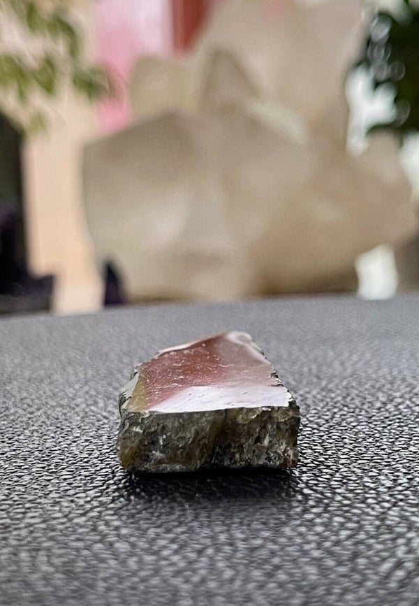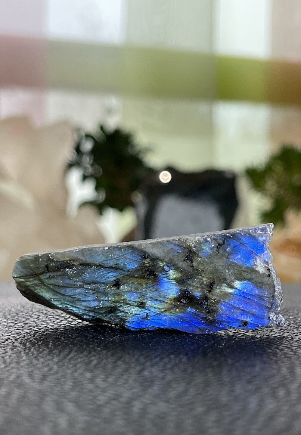 Ruw plat stukje Labradoriet uit Madagascar, aan één zijde gepolijst, kan staan, klein