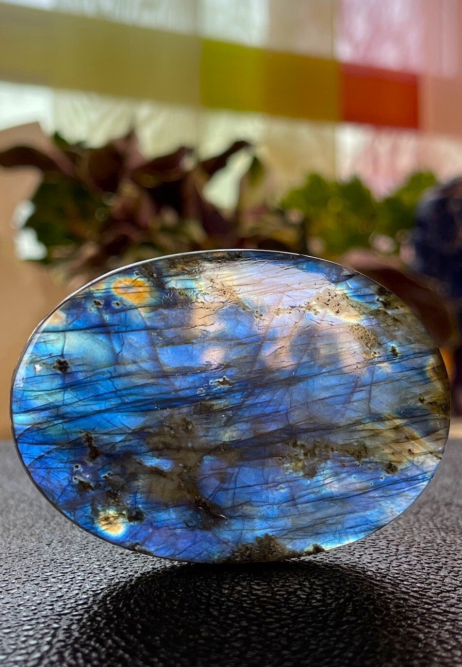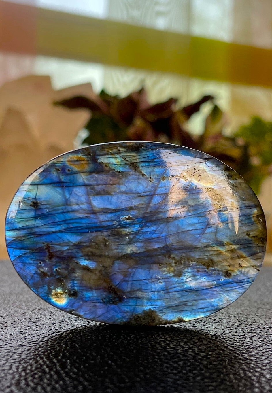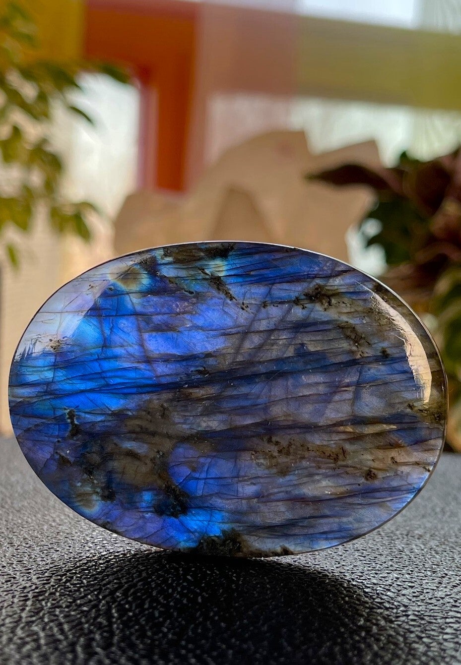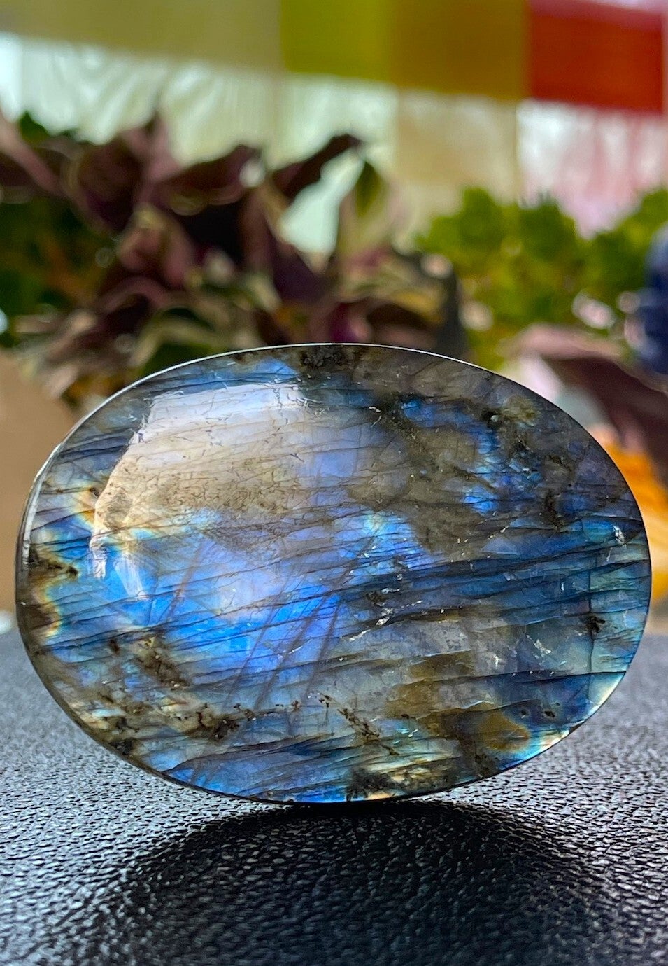 Prachtige platte Labradoriet schijf met afgeronde rand, aan twee zijden gepolijst, groot