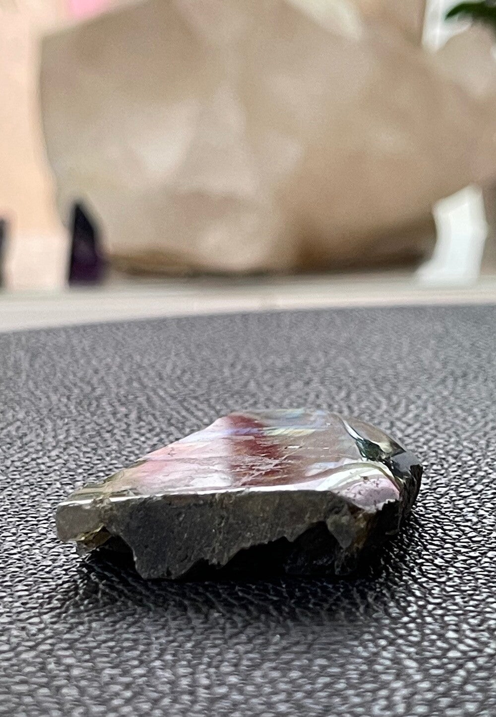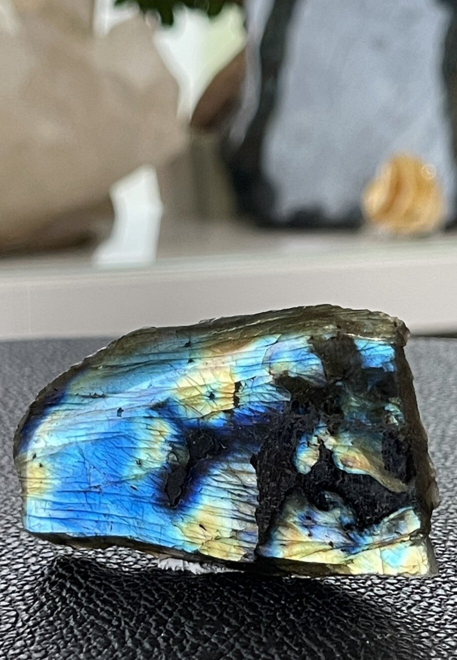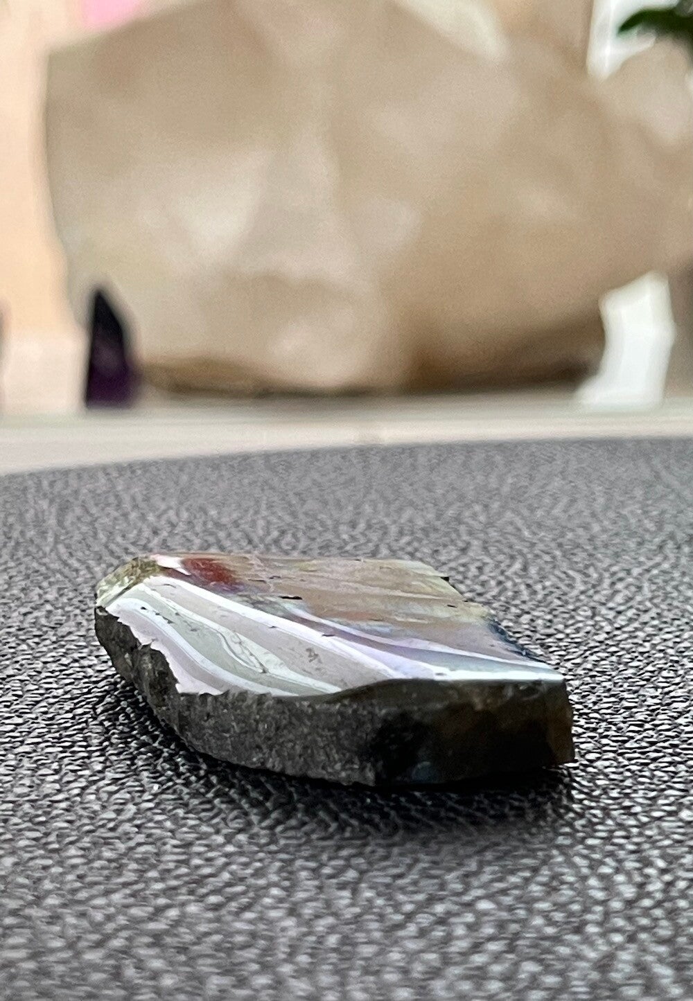 Mooi plat ruw stukje Labradoriet uit Madagascar, aan één zijde glanzend gepolijst en één zijde mat gepolijst, ook een mooie glans aan de achterkant, klein tot medium
