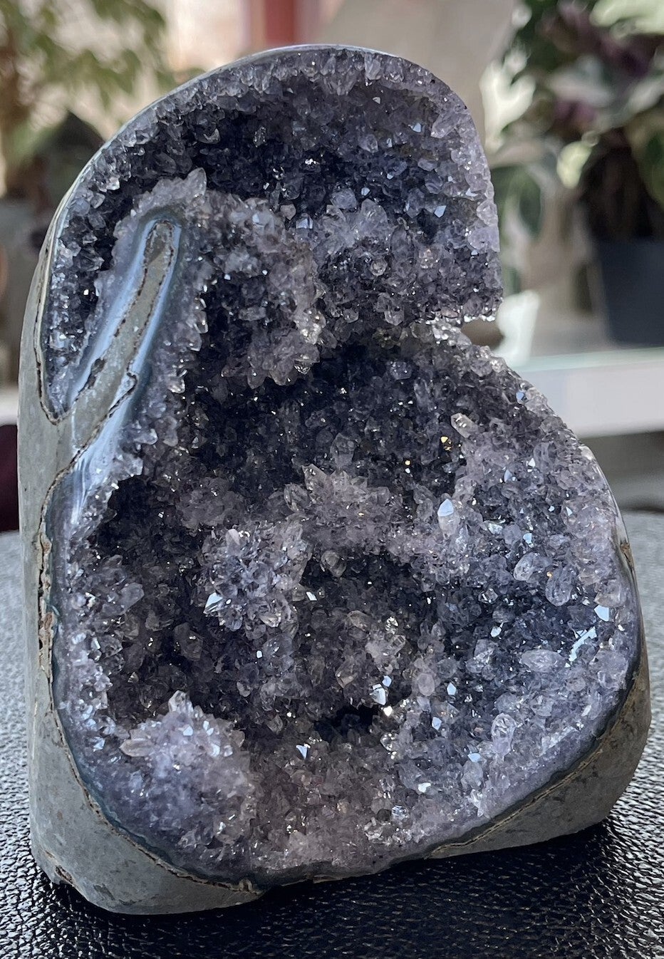Amethist geode ruw uit Brazilië, met gepolijste buitenrand, kan staan, groot
