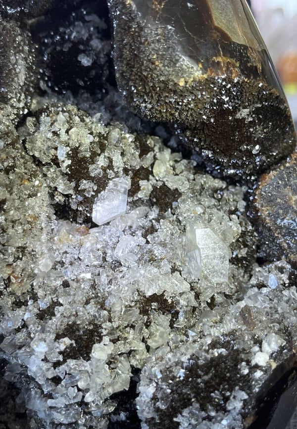 Mooi open Septarie ei met prachtige heldere kristallen, groot