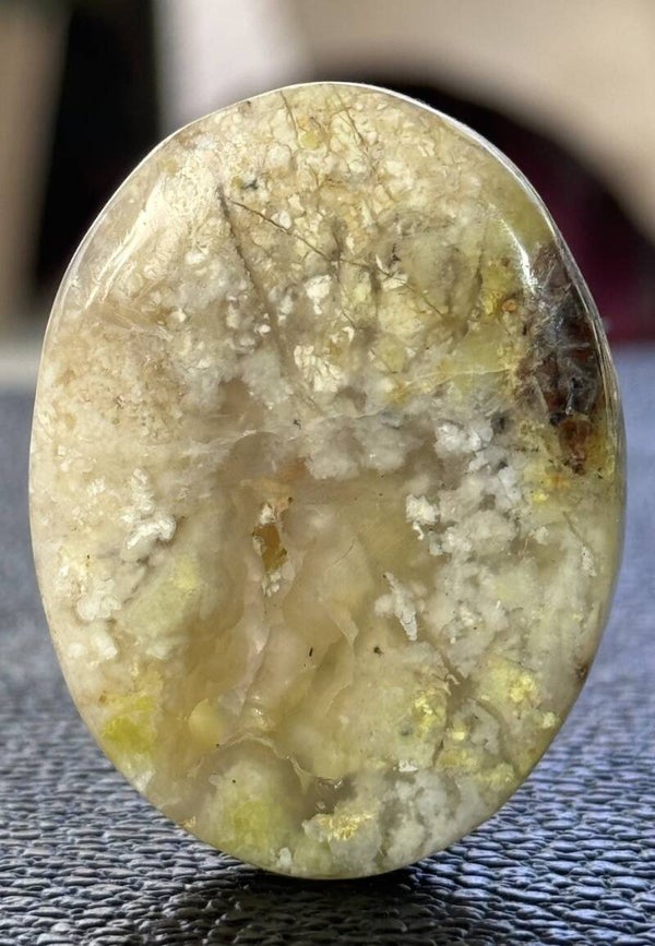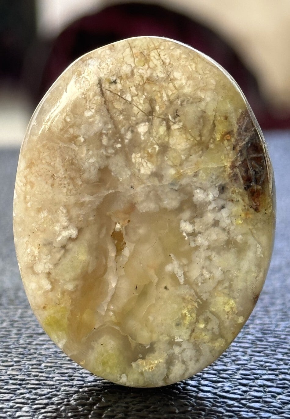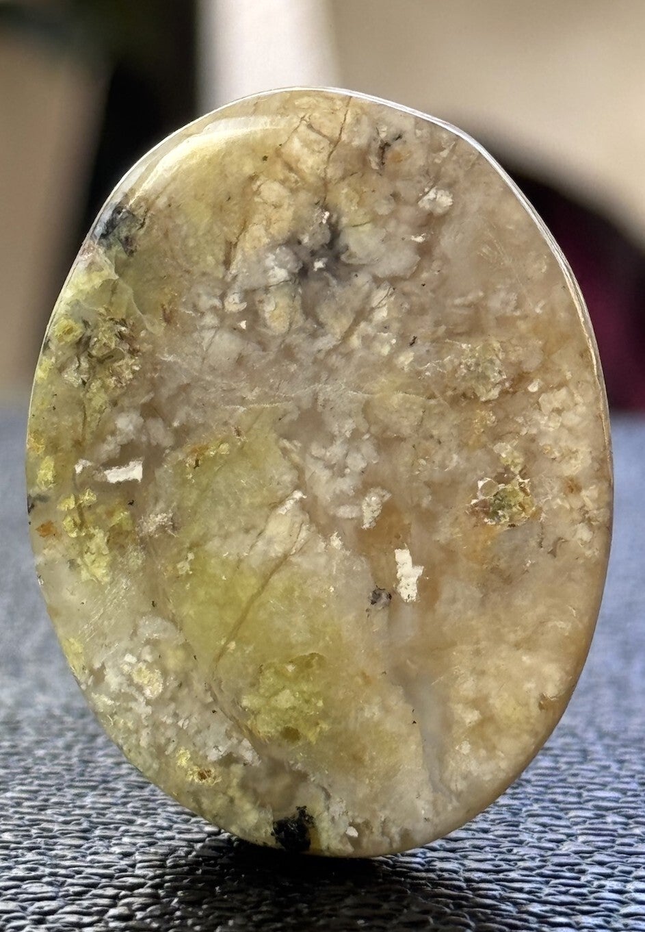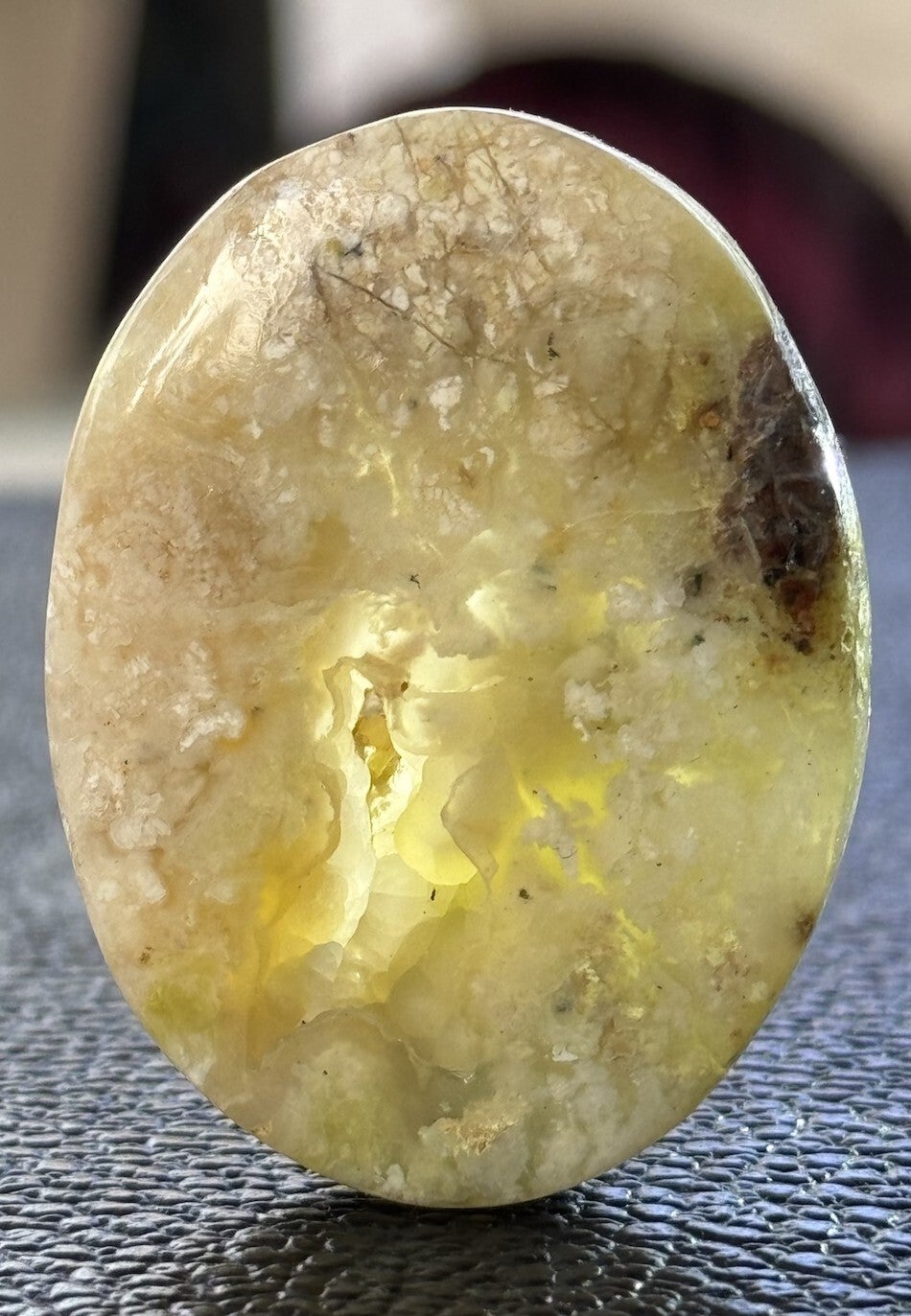 Groene Opaal platte knuffelsteen of zaksteen met open gekristalliseerd stukje in de steen