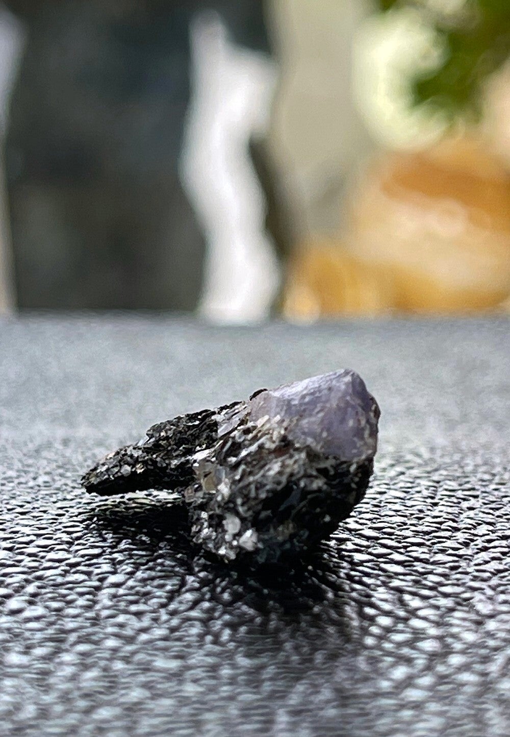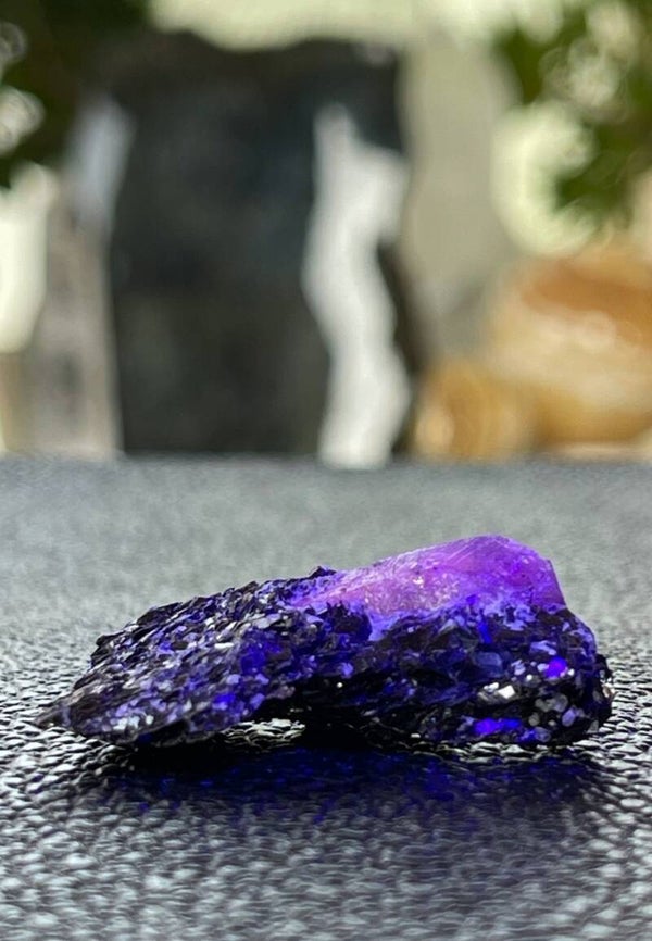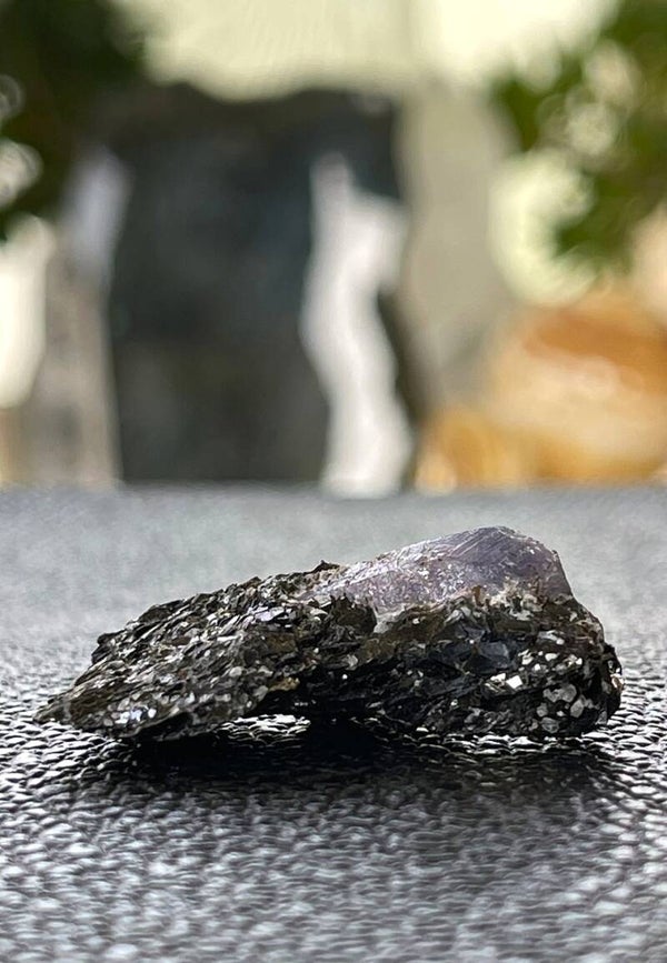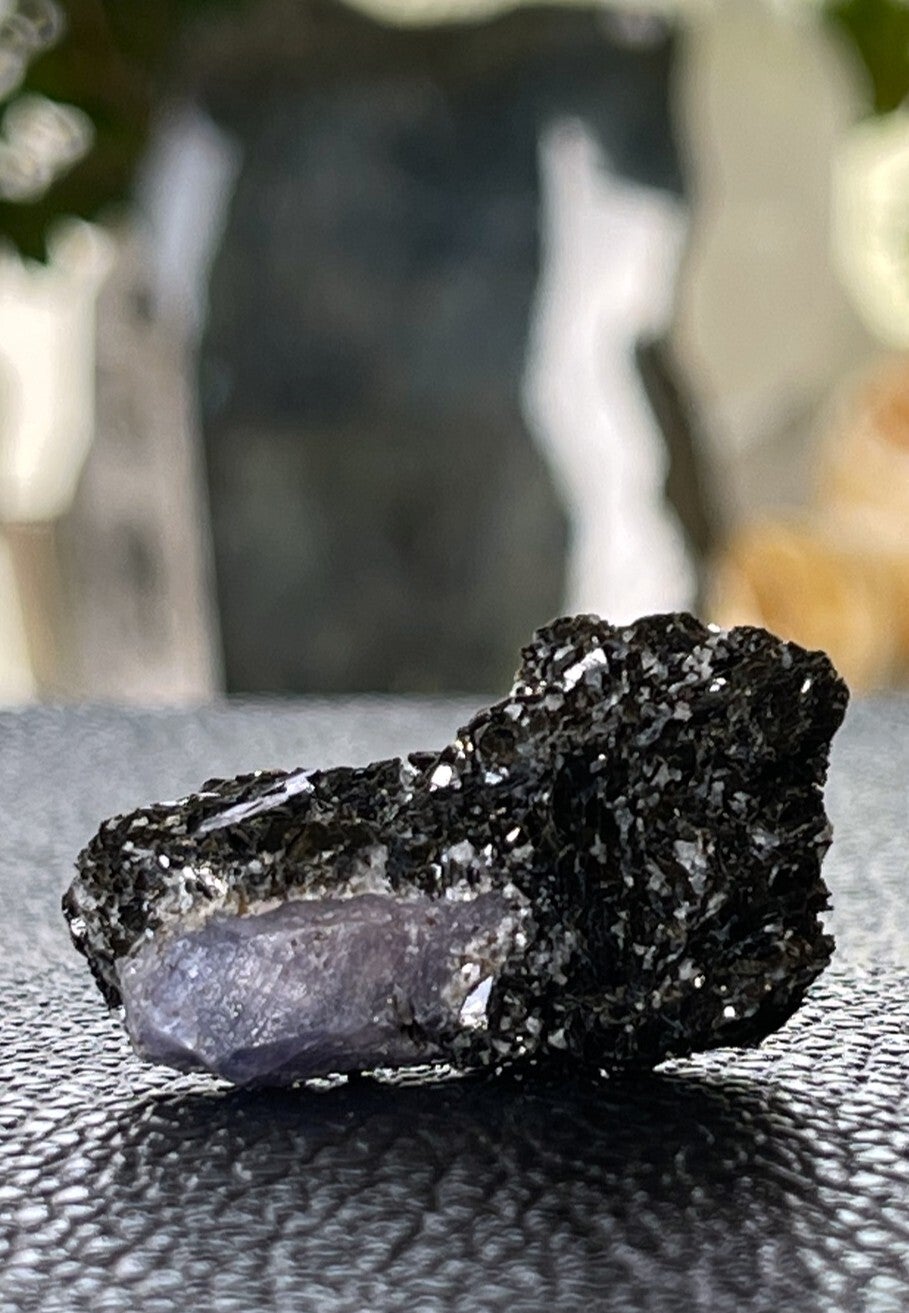 Ruw stukje Korund Saffier op Biotiet (donkere mica) uit Madagascar, verkleurend onder UV licht, klein