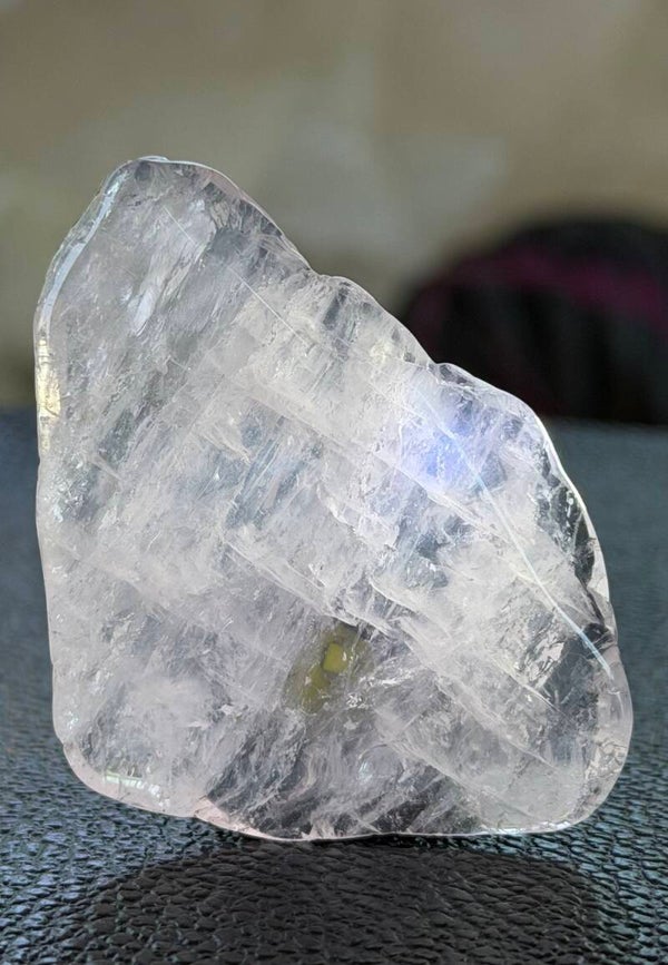 Plakje Rozenkwarts, platte schijf met ruw getrommelde buitenrand, aan beide zijden geslepen, klein