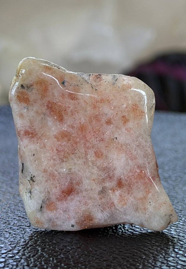 Zonnesteen platte knuffelsteen of zaksteen, met getrommelde buitenrand