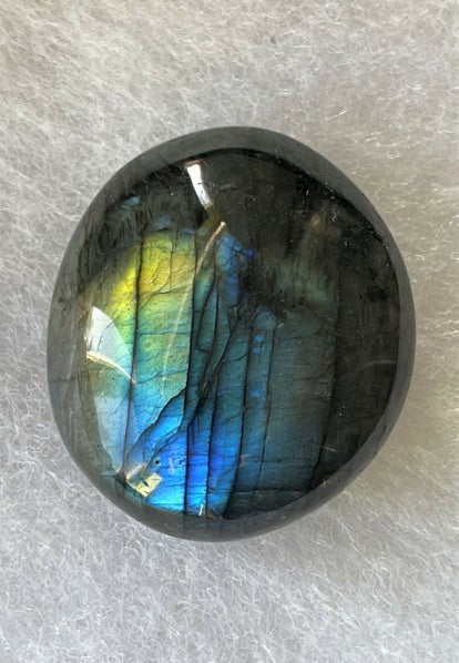 Labradoriet platte knuffelsteen of zaksteen, iets dikker en zwaarder