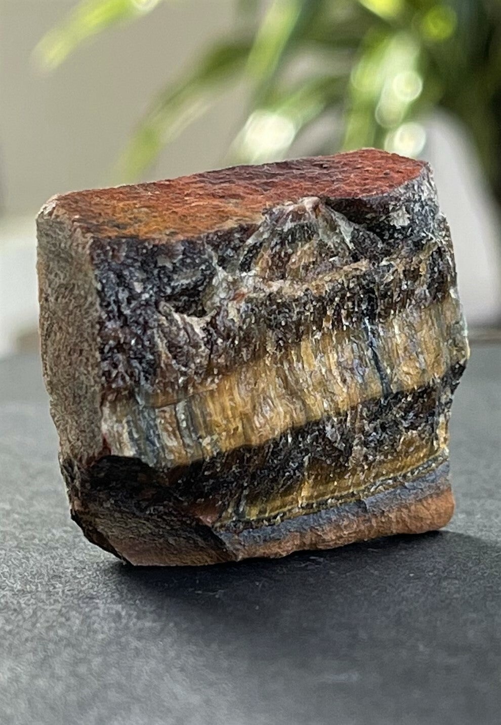 Ruw stukje Tijgeroog uit Zuid-Afrika met ruwe bovenkant, achterkant vlak, rechthoekig gesneden, klein