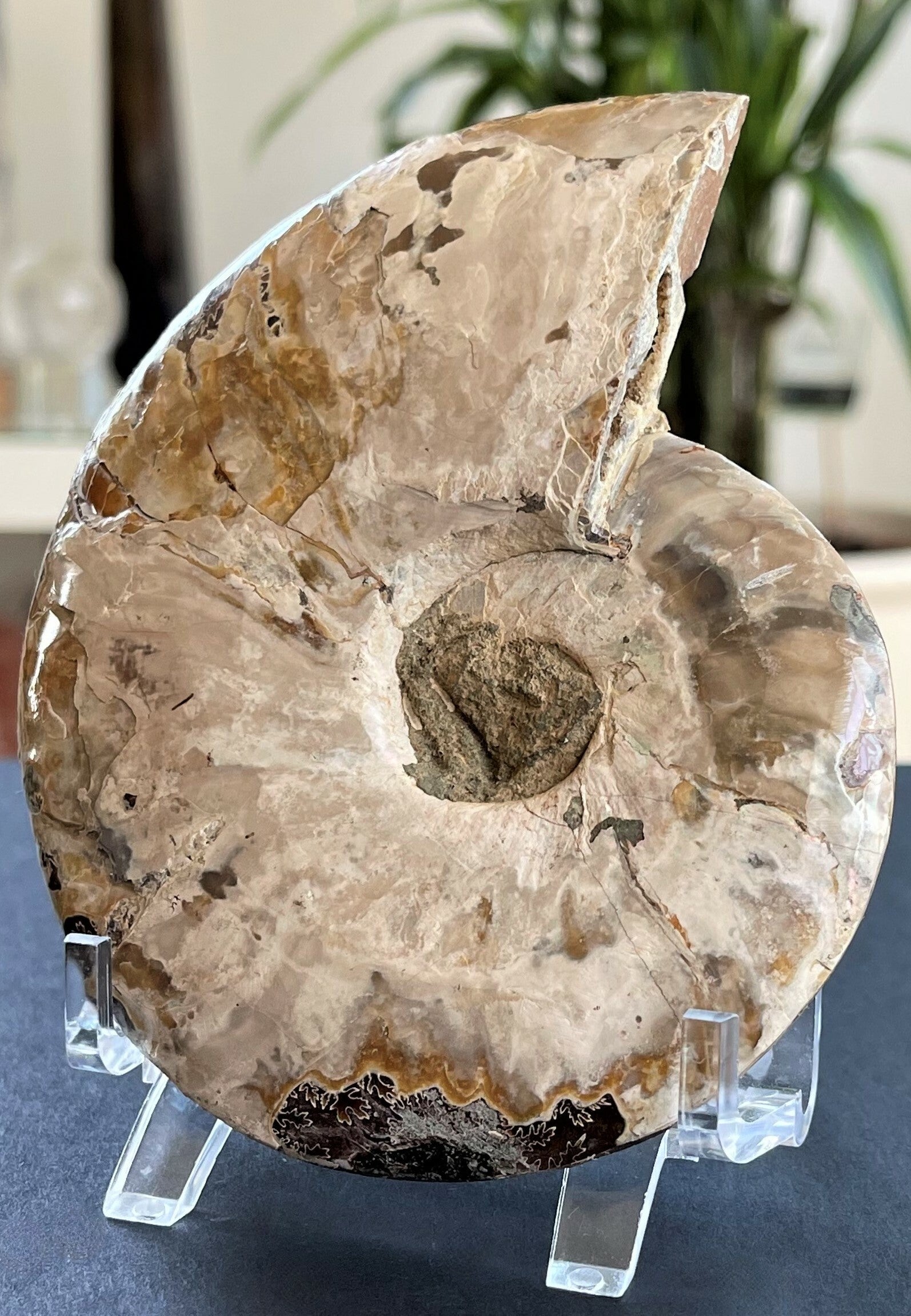 Ammoniet fossiel van een uitgestorven inktvissensoort, spiraalvormige platte schelp aan één zijde gepolijst
