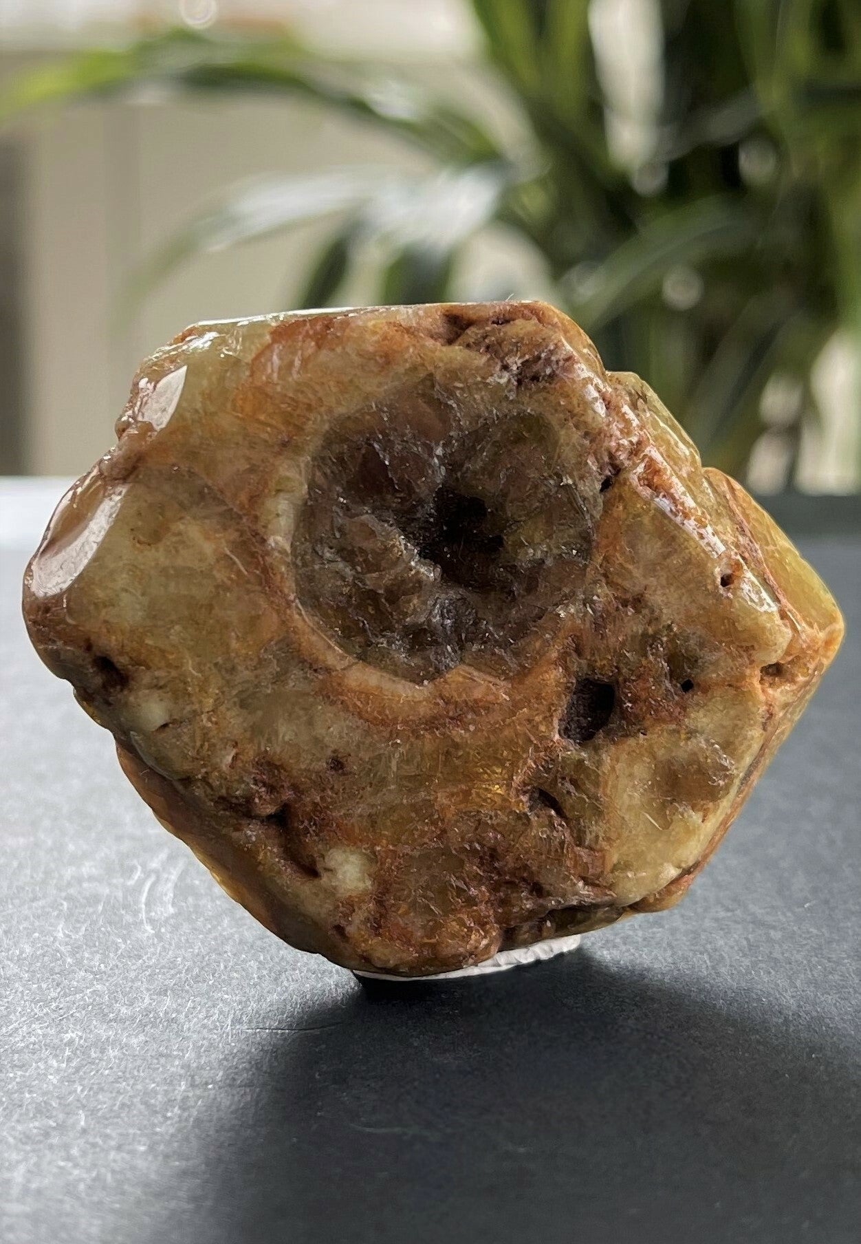 Ruw stukje Grossulaar, groen en oranje Granaat, een platte steen aan beide zijden gepolijst met ruw uiterlijk, mooi exemplaar