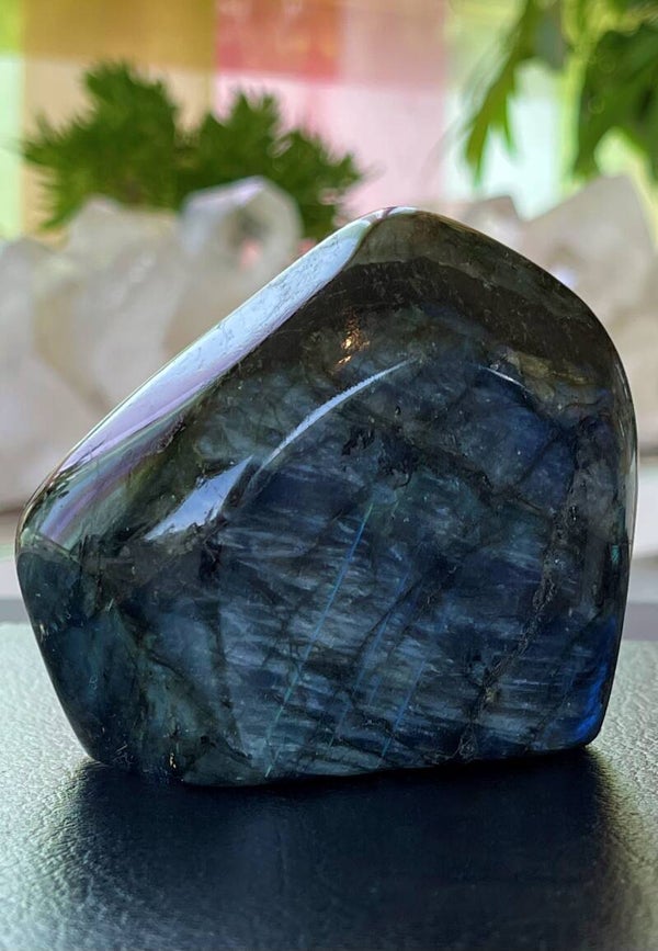 Stukje Labradoriet free form sculptuur, gepolijst uit Madagascar, kan staan