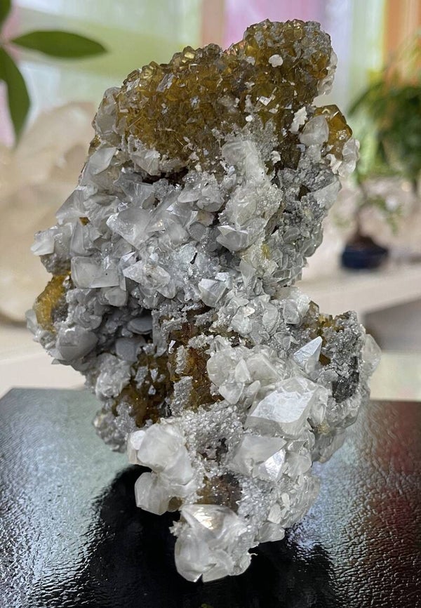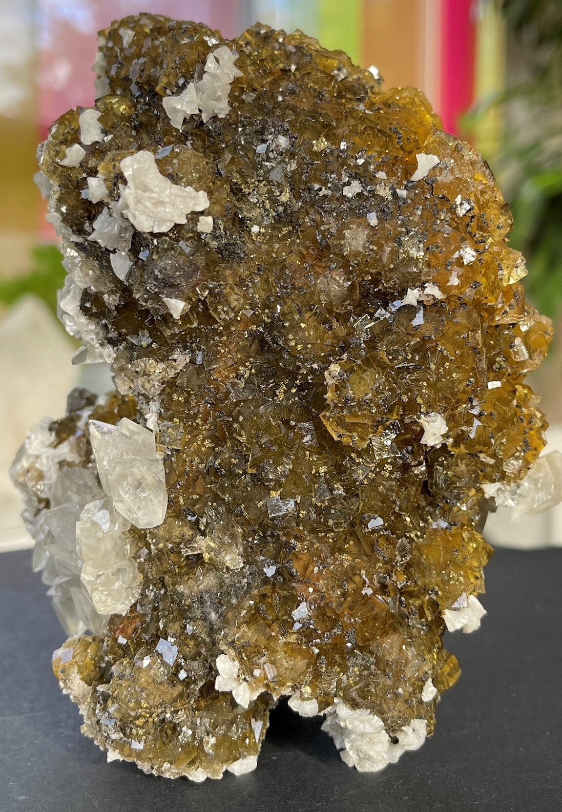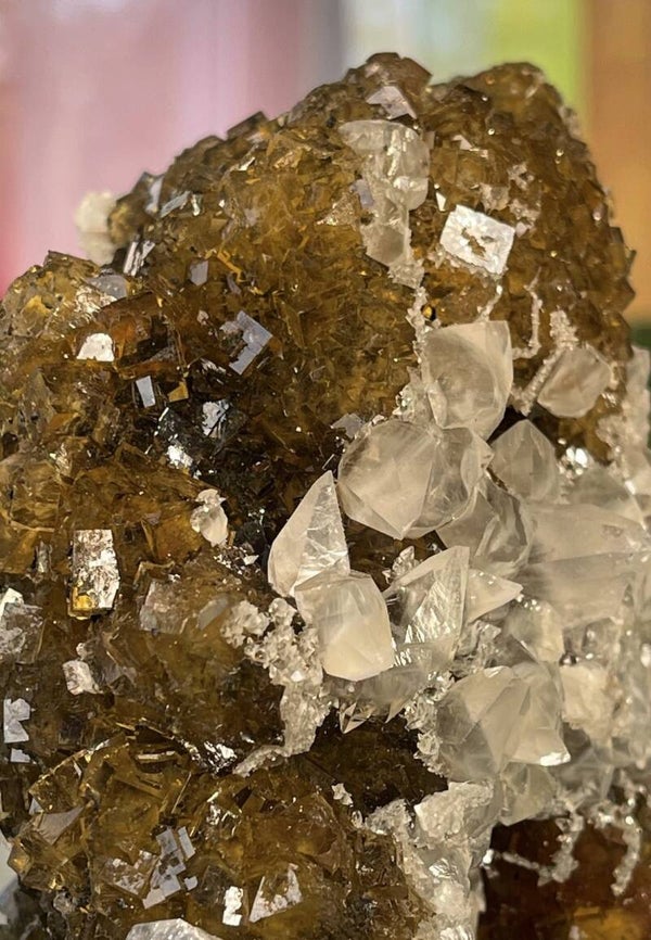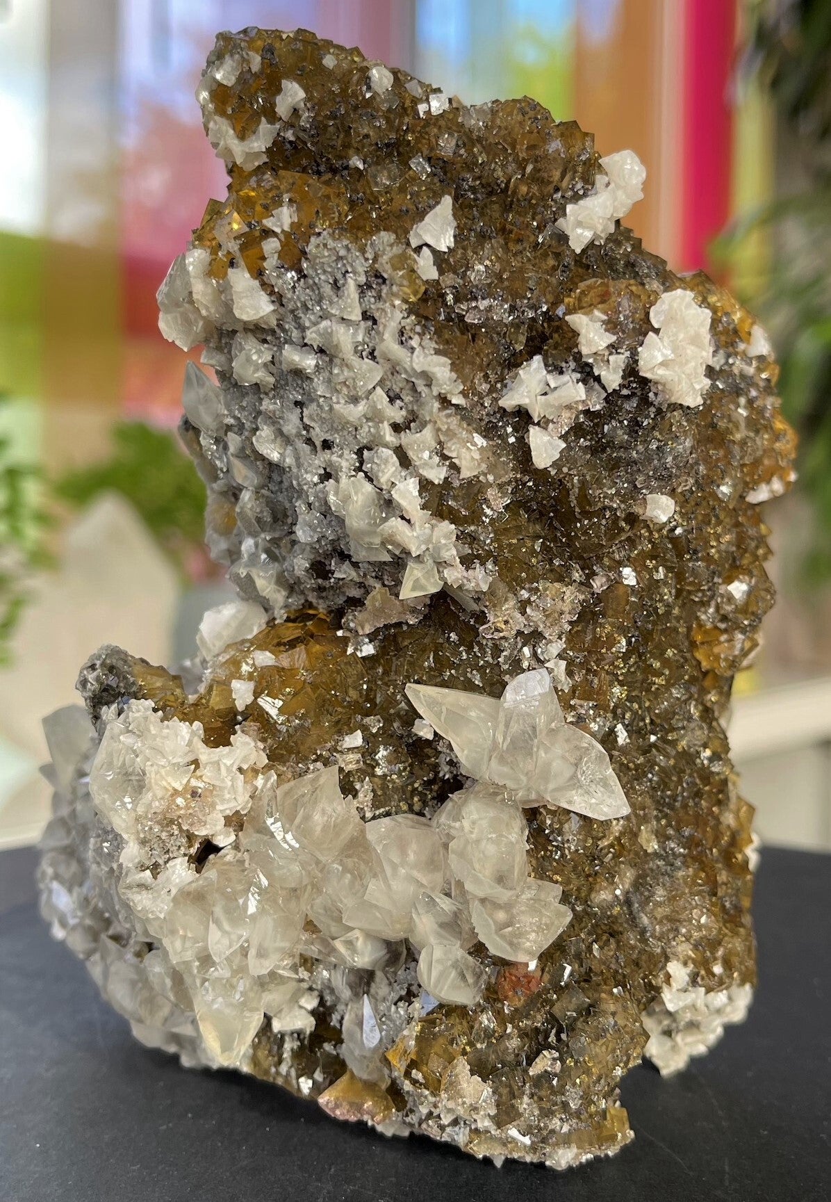 Ruw stuk gele Fluoriet met Dolomiet en Calciet dubbeleinders uit Mina Moscona, Villabona, Asturië Spanje, groot