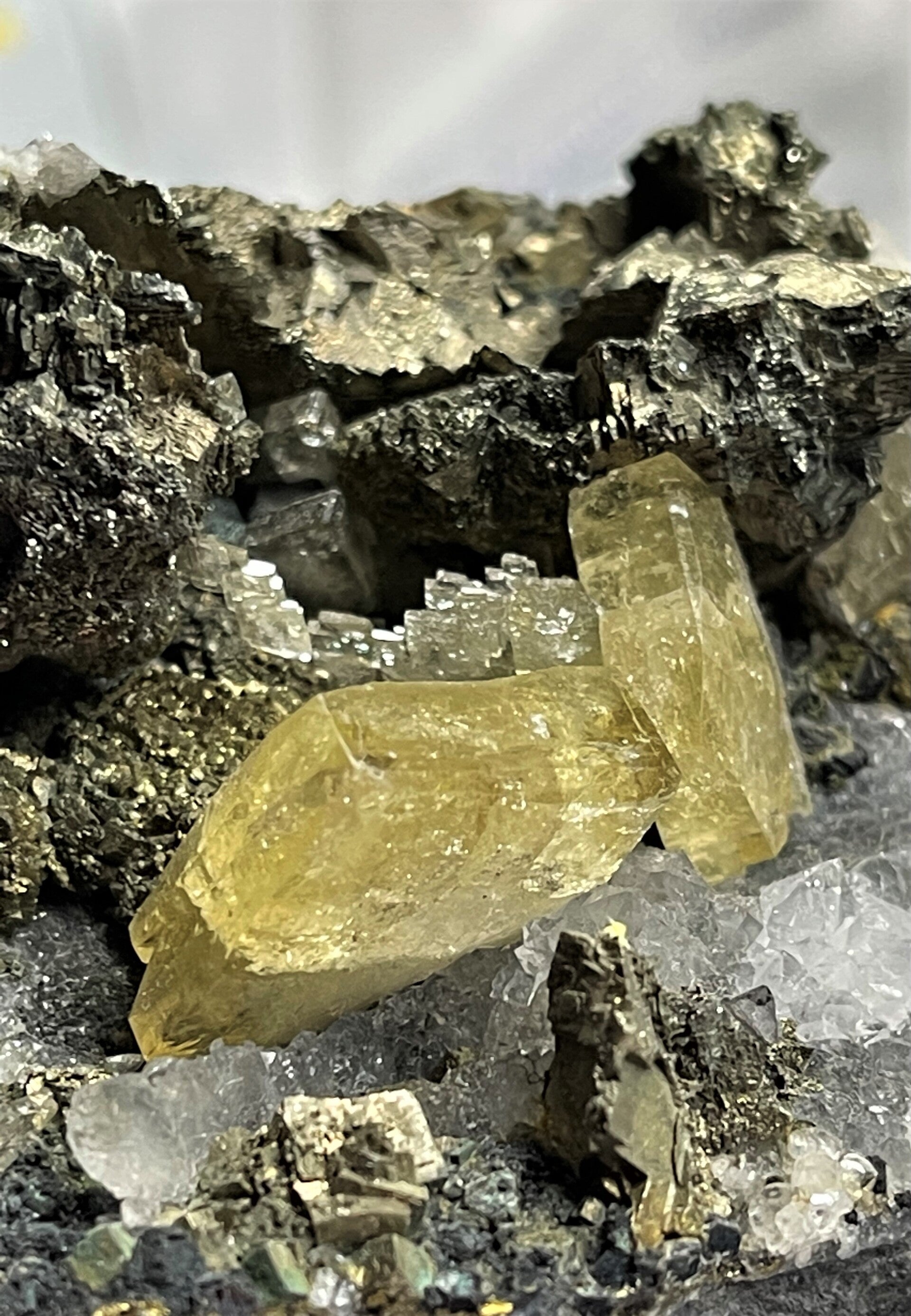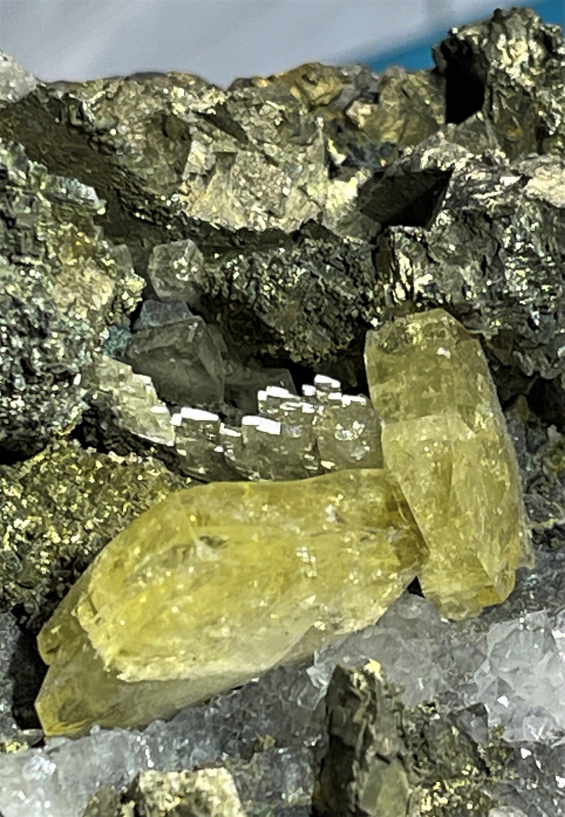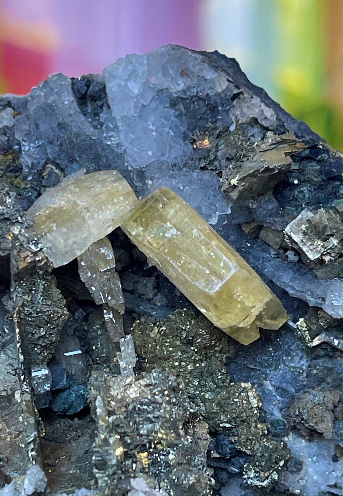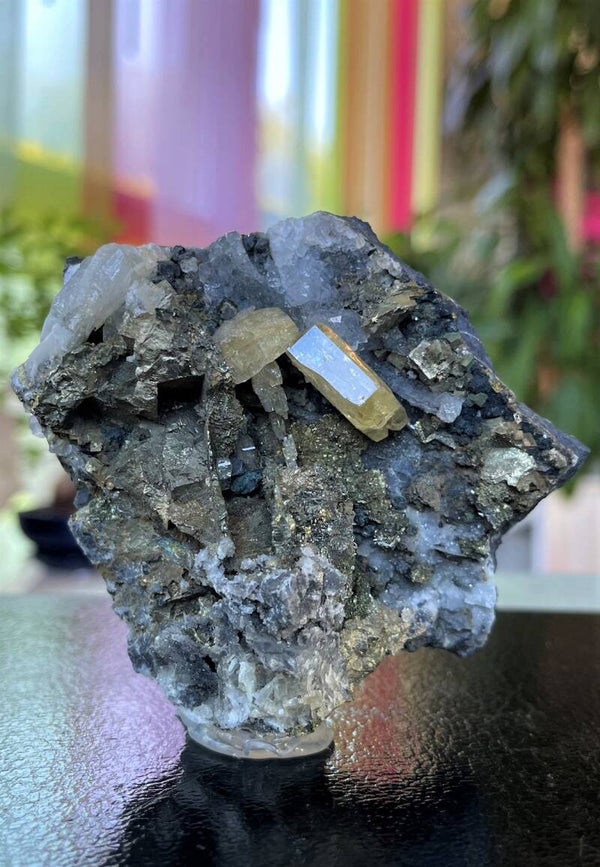 Ruw stukje Pyriet met Apophylliet en gele Calciet op matrix, medium, mooi stuk