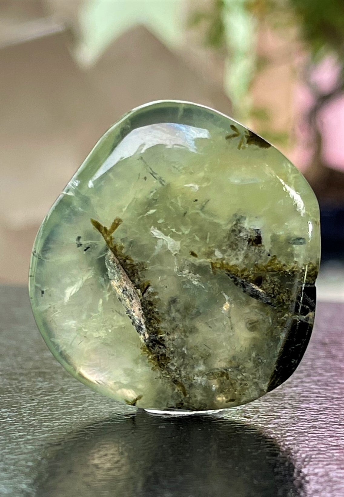 Prehniet met Toermalijn platte knuffelsteen of zaksteen, met natuurlijke open stukjes in de steen